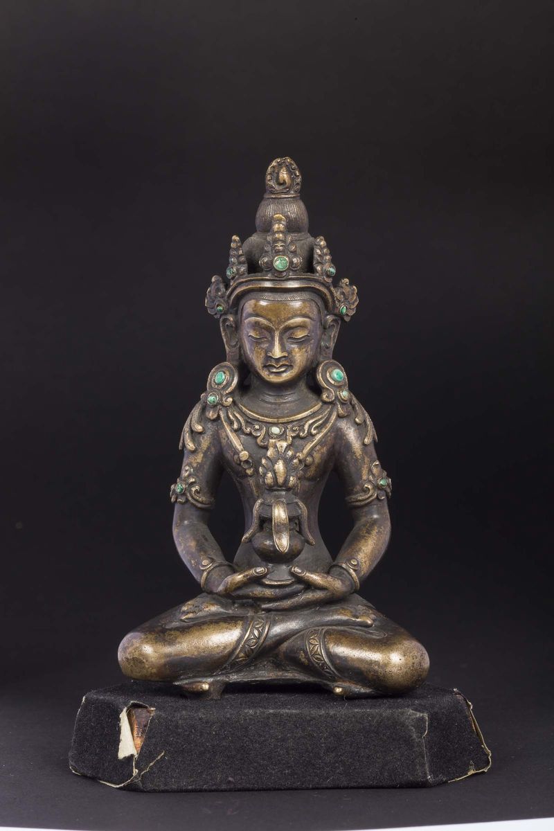 A bronze figure of Amithaba with jadeite inlays, Tibet, 19th century