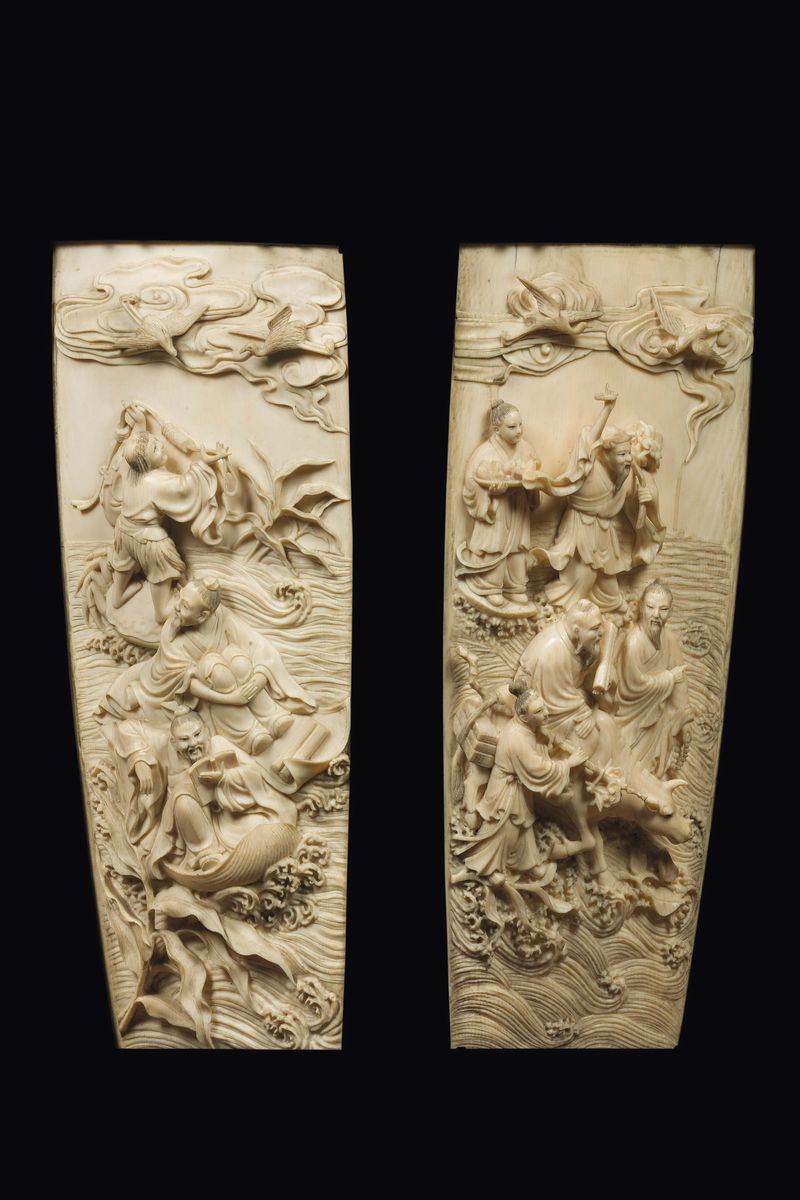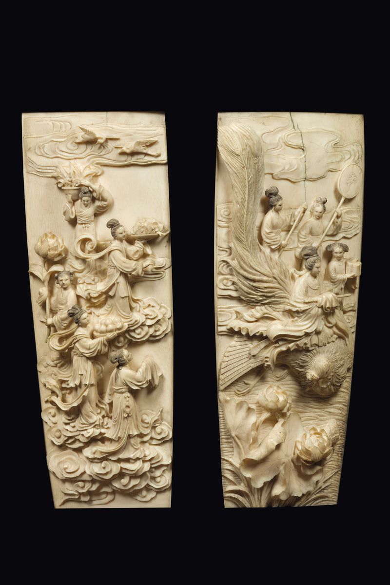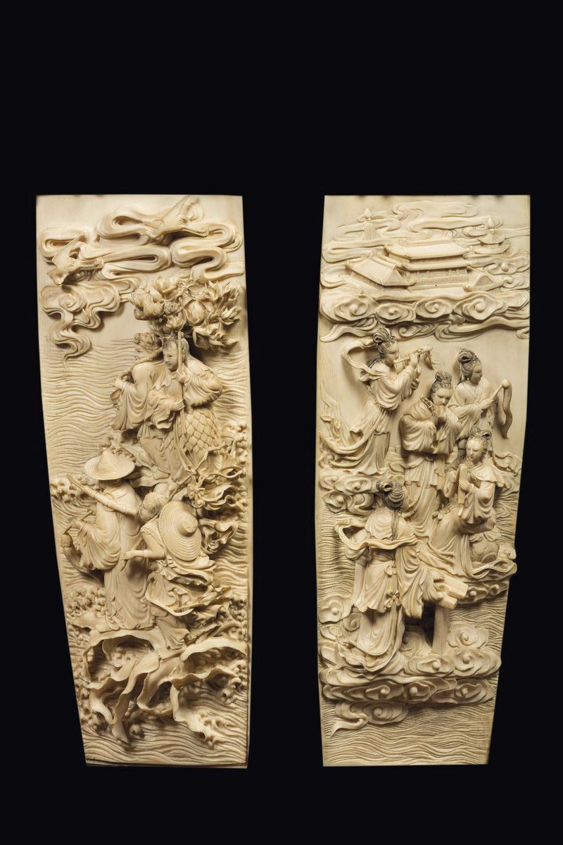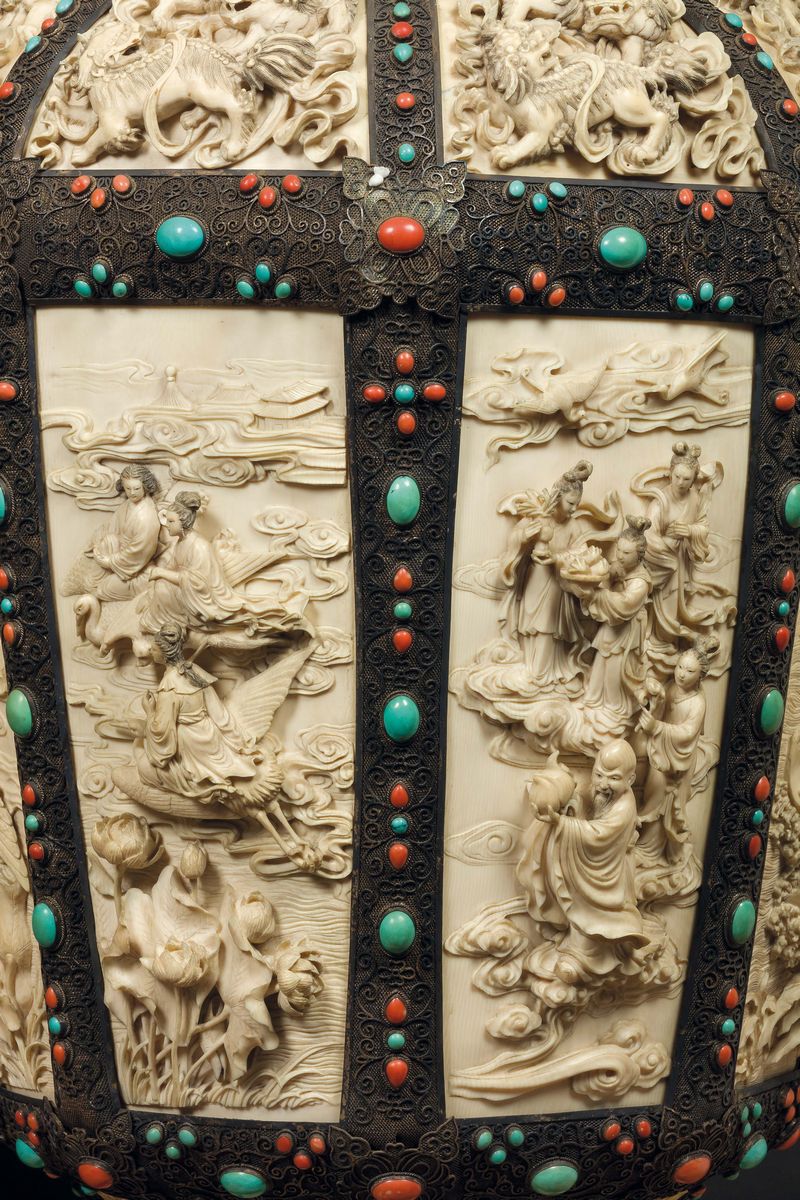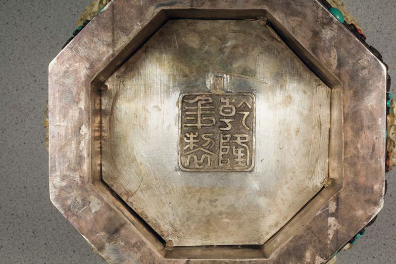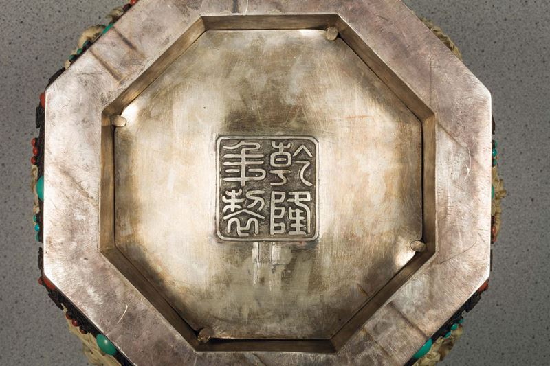 A large and rare pair of ocatagonal ivory vases with silver filigree details and coral and turquoise inlays on a huanghuali [..]
