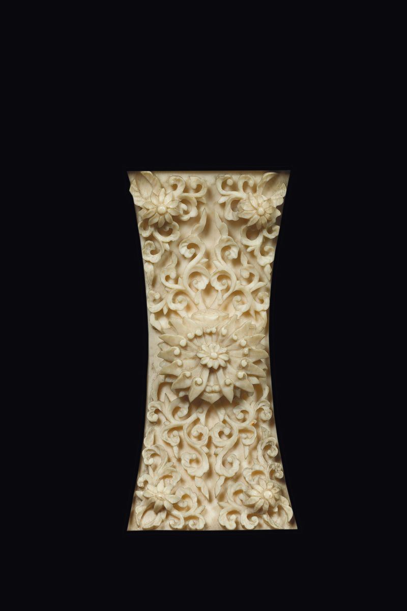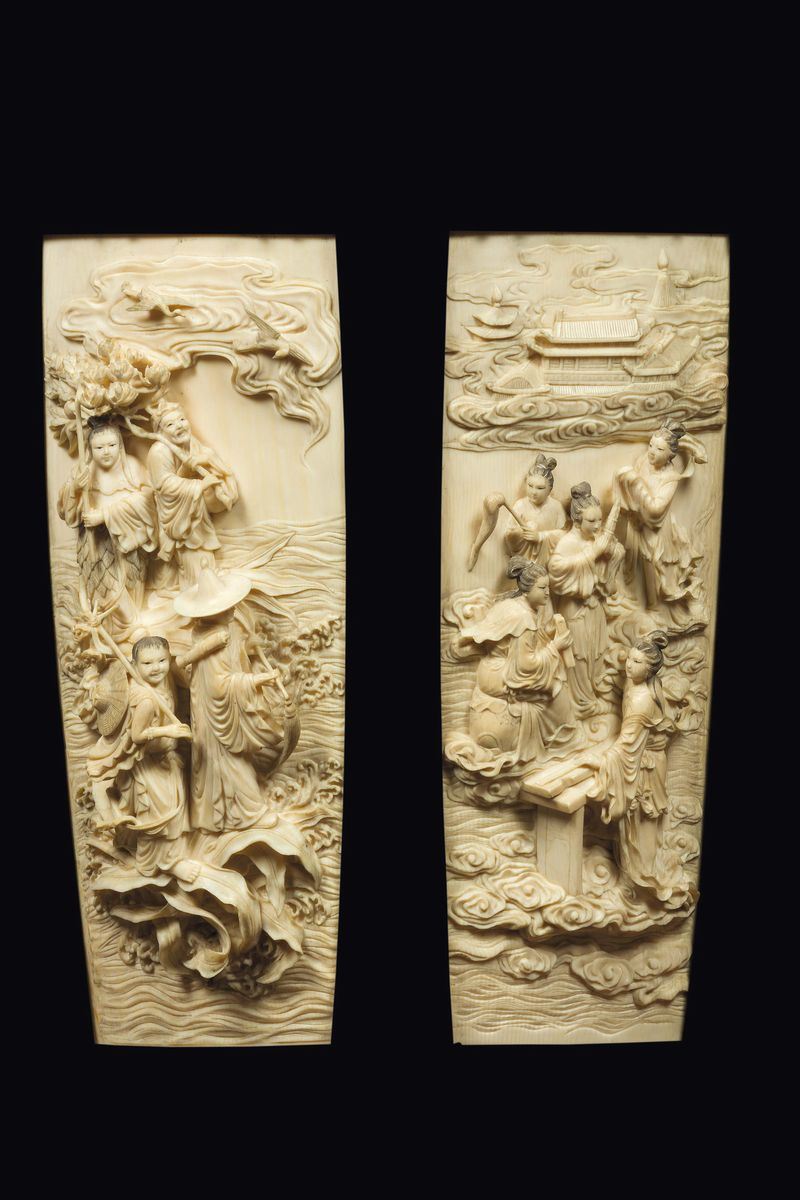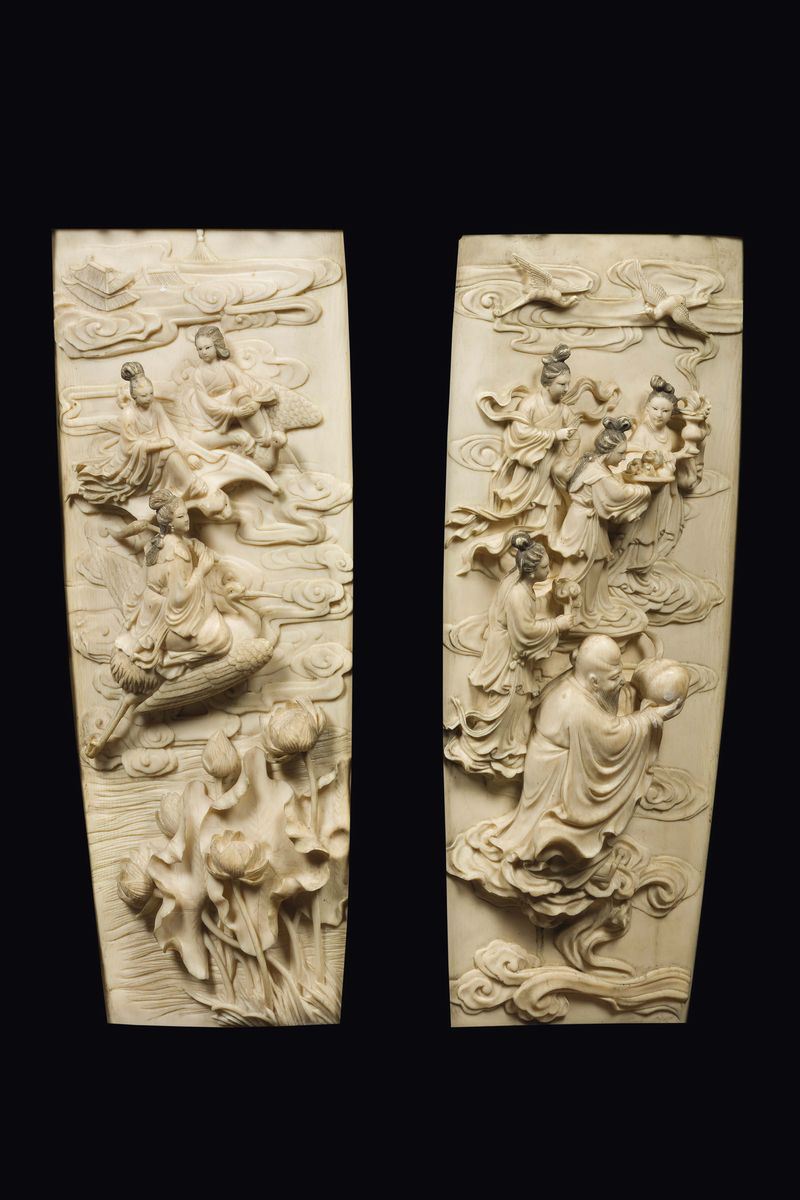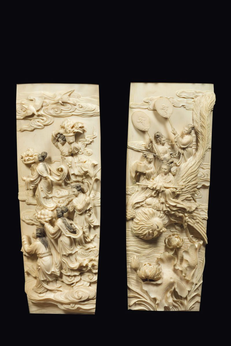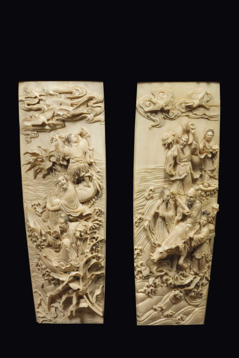 A large and rare pair of ocatagonal ivory vases with silver filigree details and coral and turquoise inlays on a huanghuali [..]