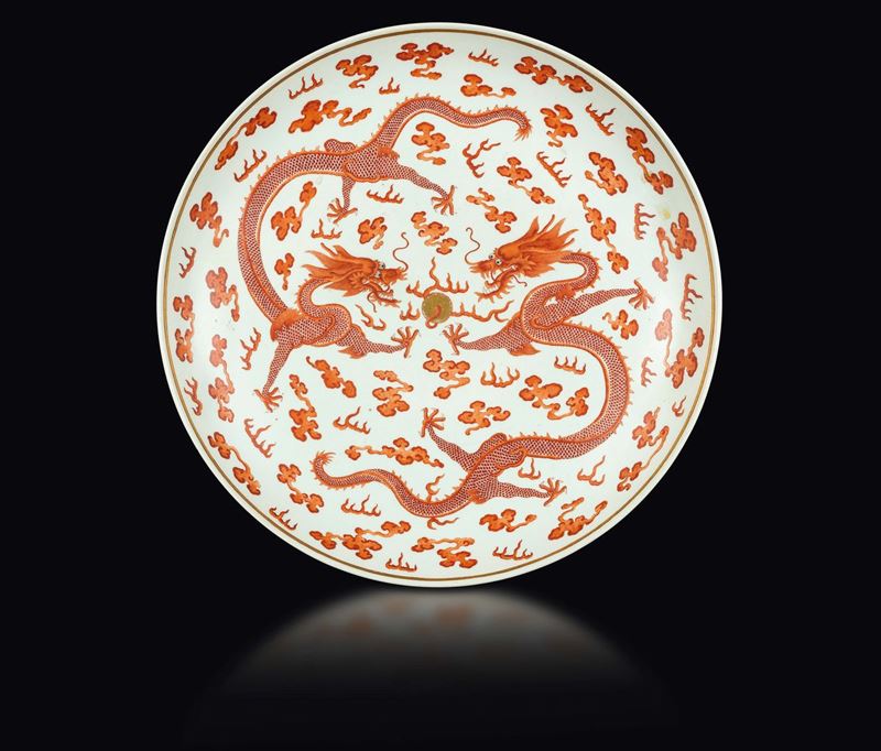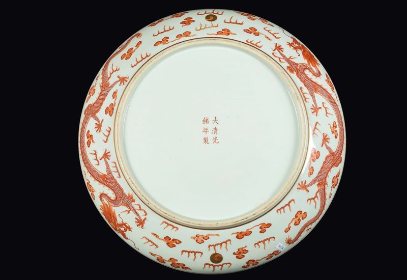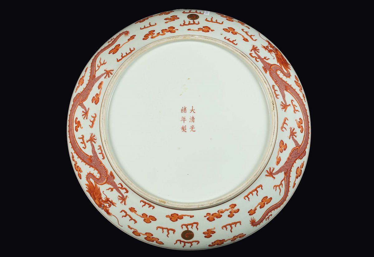 A large pair of polychrome enamelled porcelain dishes with red dragons between clouds, China, Qing Dynasty, Guangxu Mark [..]