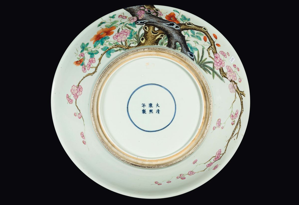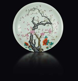 A large polychrome enamelled porcelain dish with cherry blossoms, China, Qing Dynasty, 19th century
