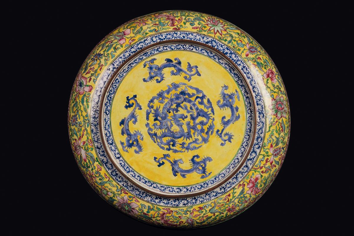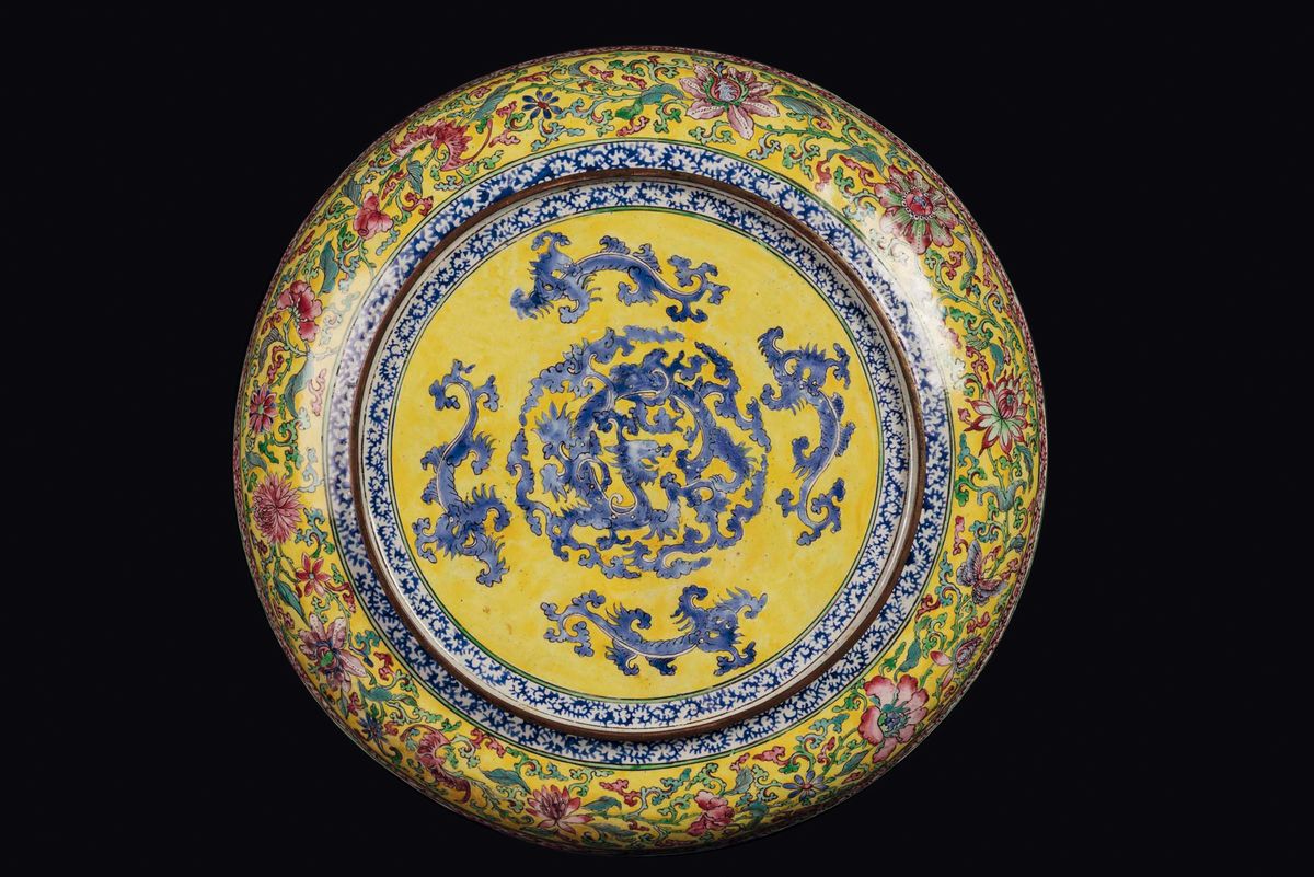 A pair of Canton enamelled dishes with schoolars and inscriptions, China, Qing Dynasty, Qianlong Period (1736-1795)