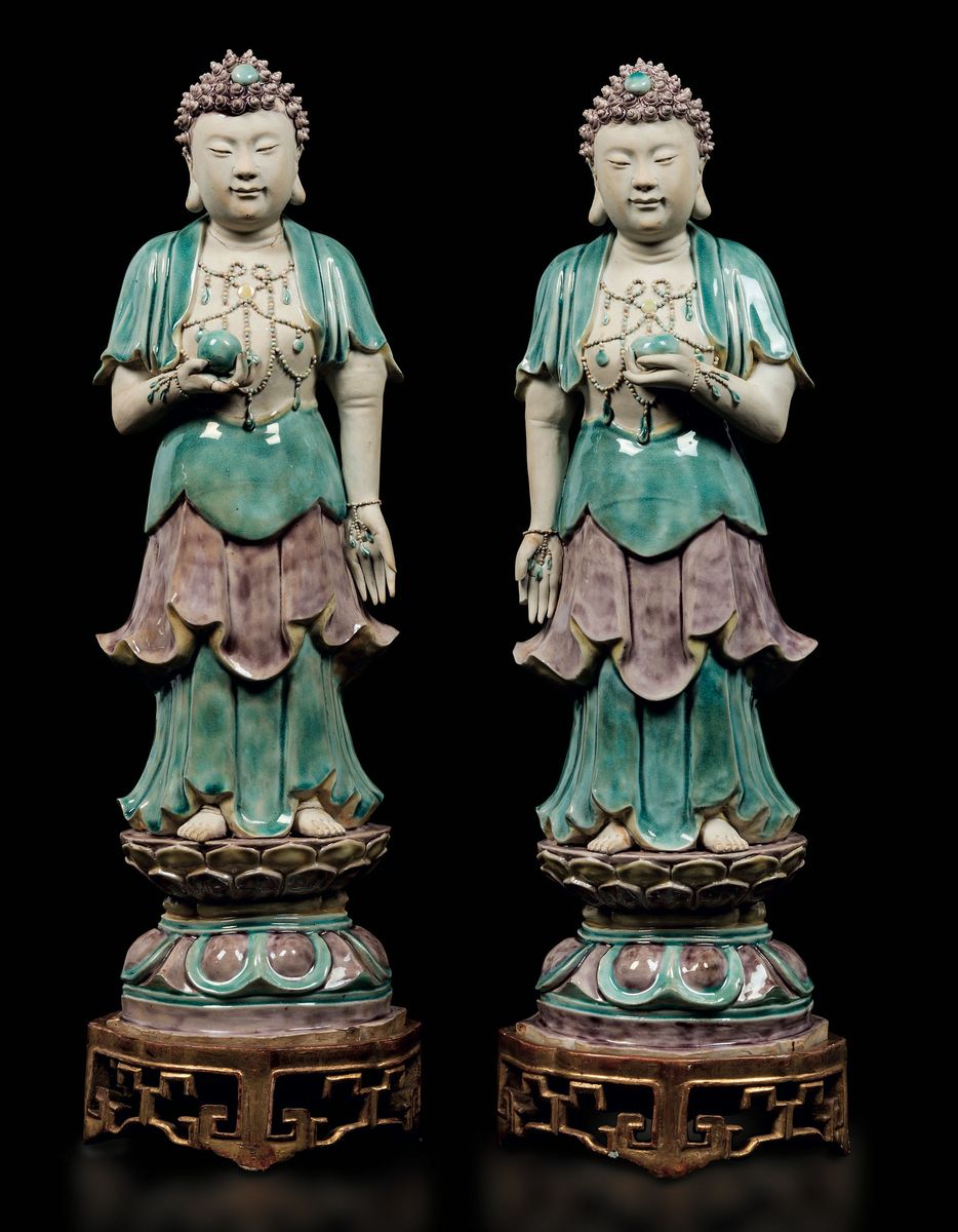 A pair of glazed bisquit figures of standing Buddha with peaches, China, Qing Dynasty, Kangxi Period (1662-1722)