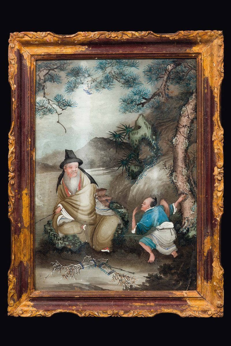 A pair of paintings on glass depicting wise men with goats and fisherman, China, Qing Dynasty, 19th century
