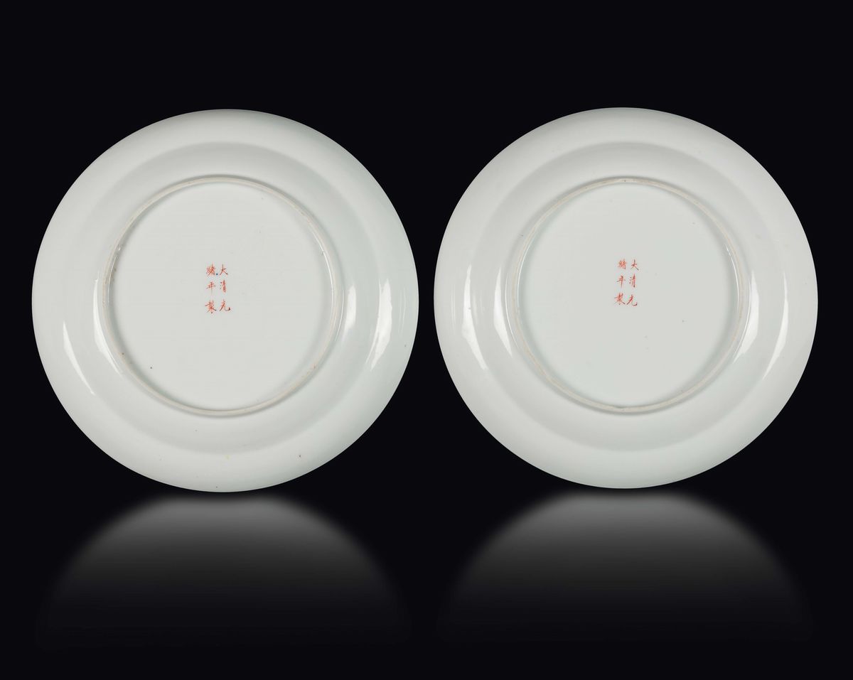 A pair of polychrome enamelled porcelain dishes with flower pots, China, Qing Dynasty, Guangxu Mark and of the Period (18 [..]