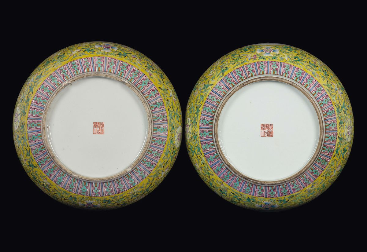 A pair of yellow-ground polychrome enamelled porcelain vases with deer-handles with landscapes within reserves, China, Qing [..]
