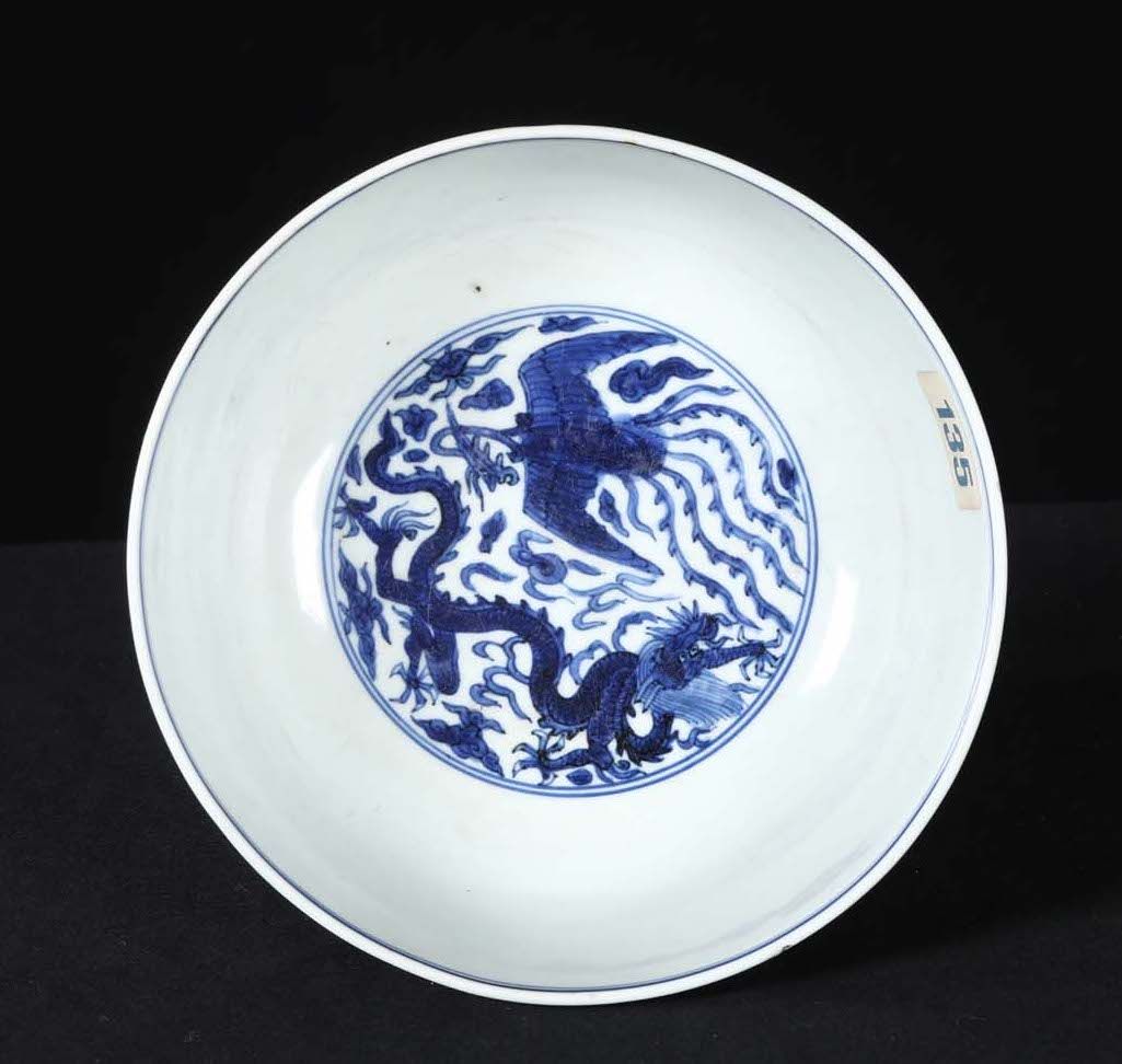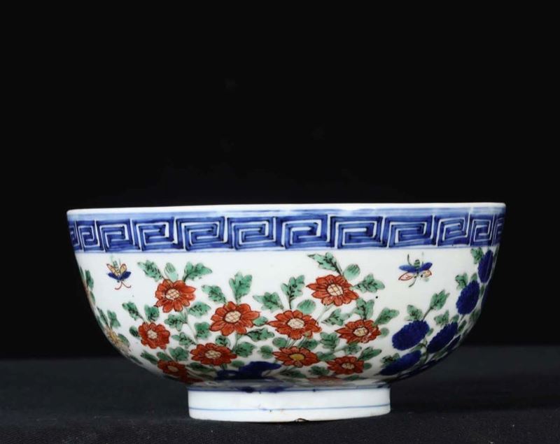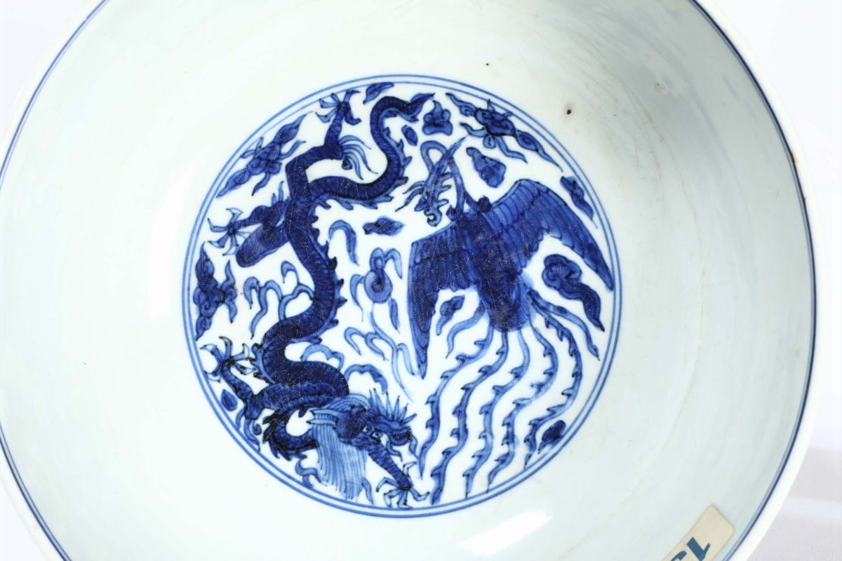 A polychrome enamelled porcelain bowl with floral decoration and inside depicting dragon and phoenix, China, Ming Dynasty, [..]
