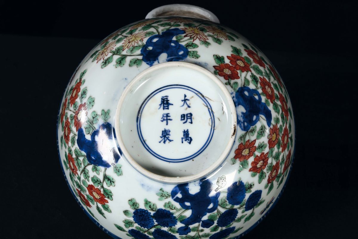 A polychrome enamelled porcelain bowl with floral decoration and inside depicting dragon and phoenix, China, Ming Dynasty, Wanli Mark and of the Period (1573-1619)