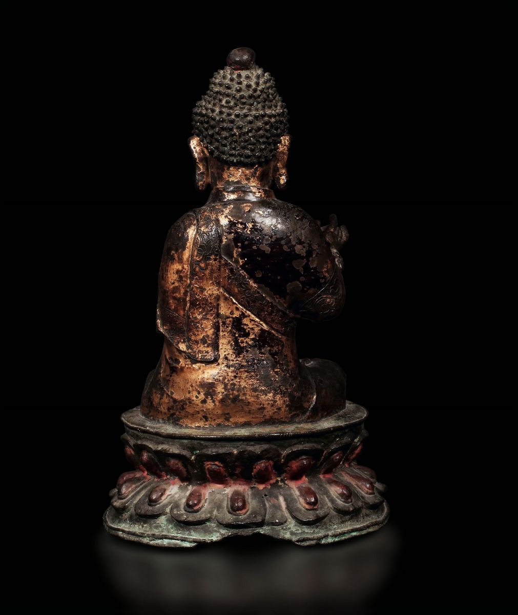 A semi-gilt bronze figure of Buddha on a double lotus flower, China, Ming Dynasty, 17th century