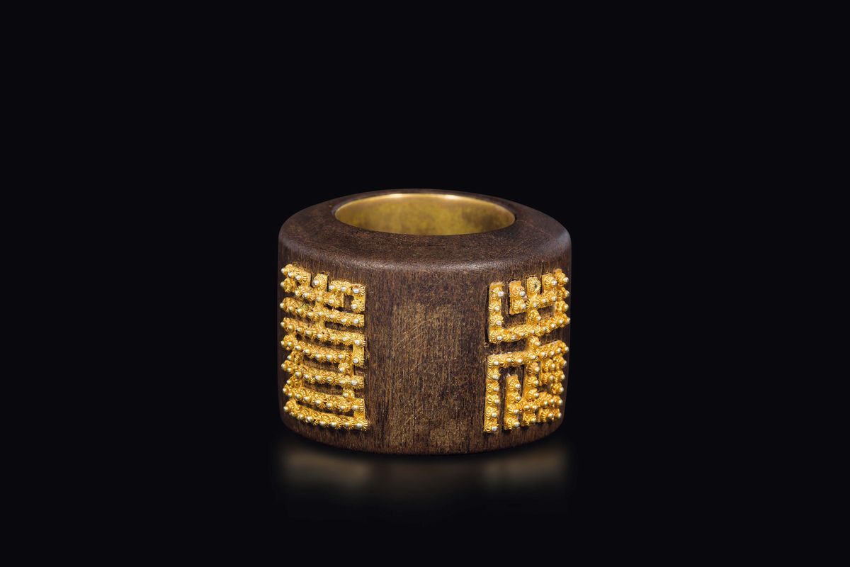 A wooden archer ring with golden details, China, Qing Dynasty, 19th century