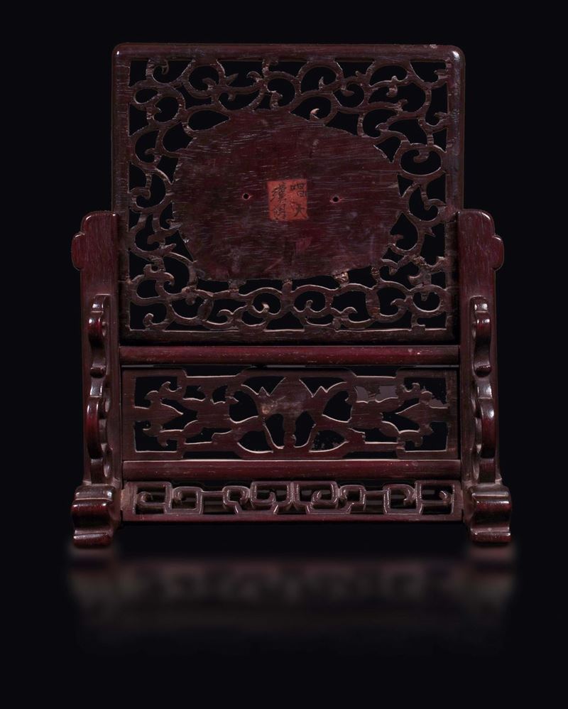 A wooden table screen with white jade horse plaque, China, Qing Dynasty, 18th century