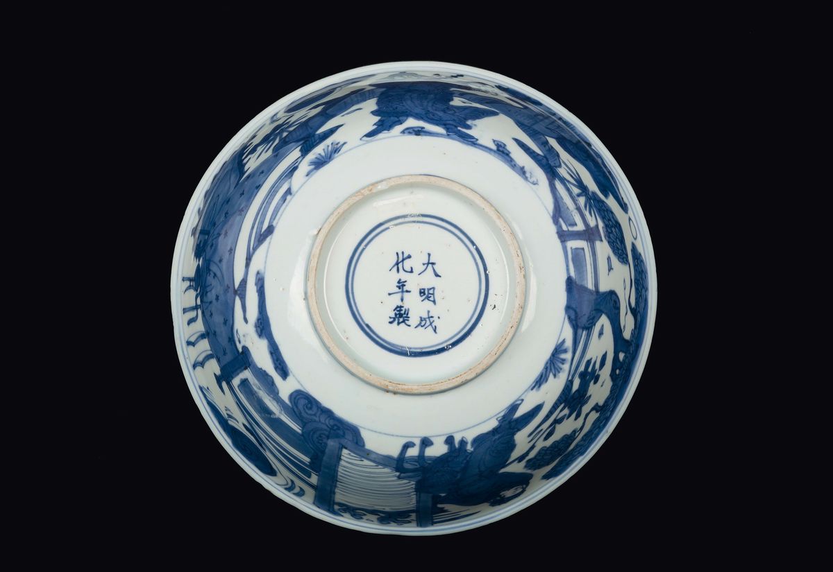 Lot of blue and white porcelains, two Wanli dishes and a bowl depicting wiseman with apocryphal Chenghua mark, China, Ming/Qing Dynasty, 16th/17th century