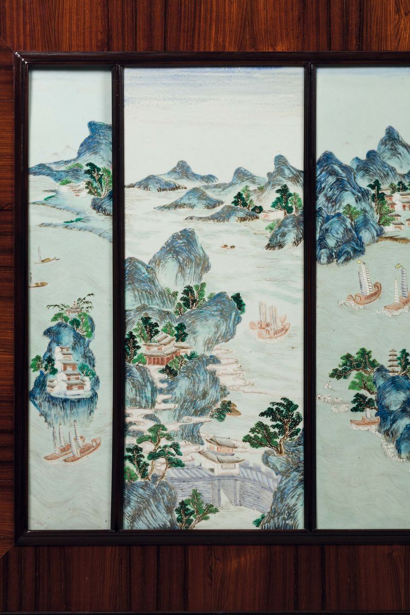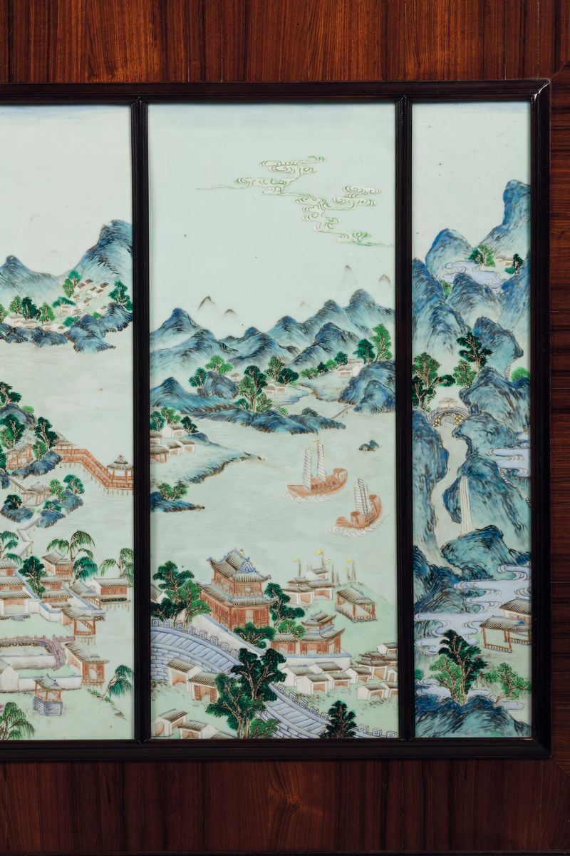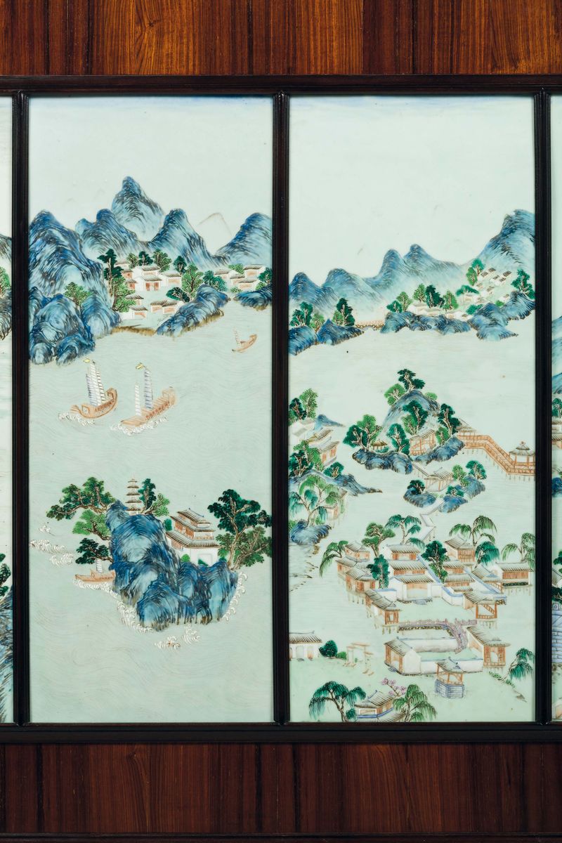 Six polychrome enamelled porcelain plaques depicting lake landscape, China, Qing Dynasty, Qianlong Period (1736-1795)