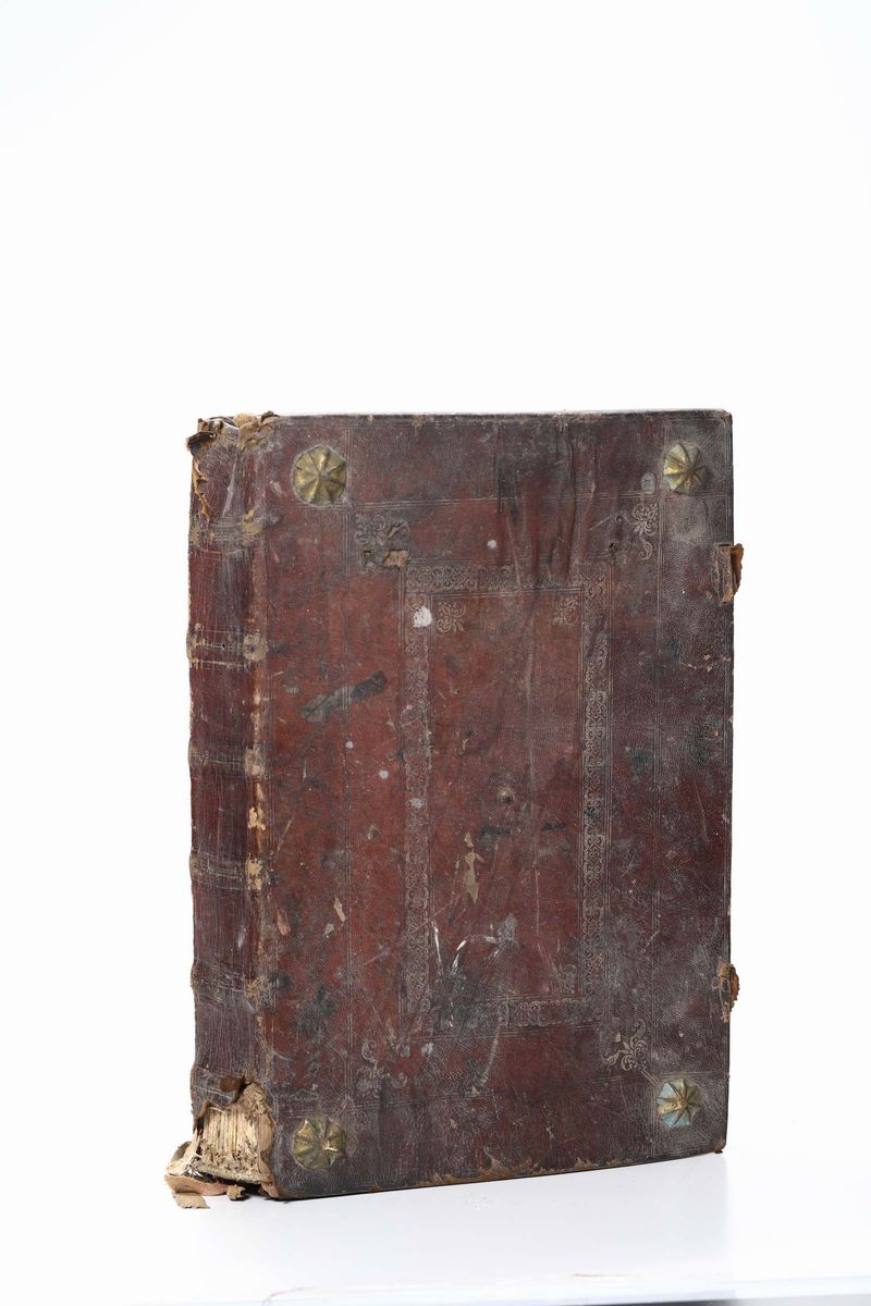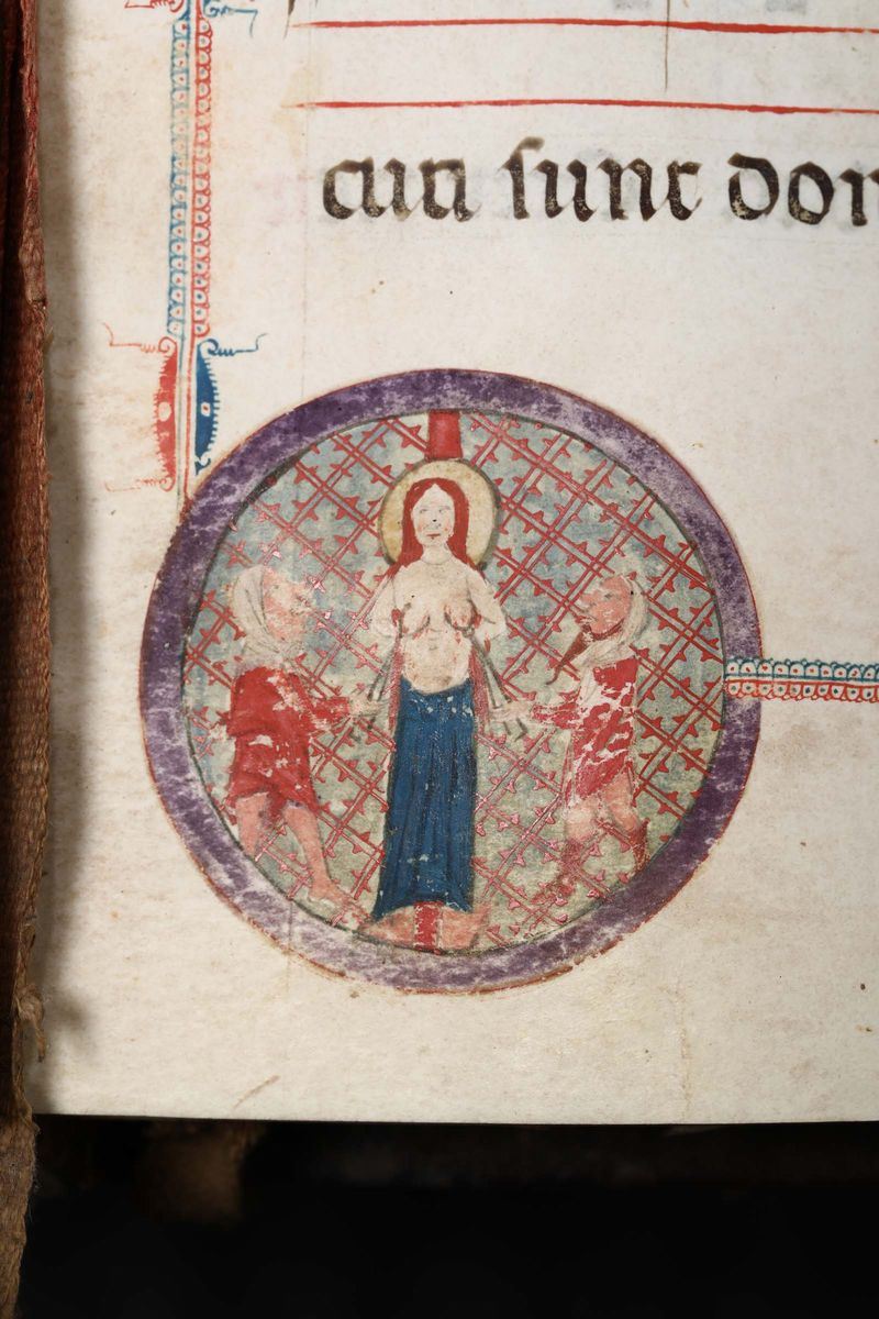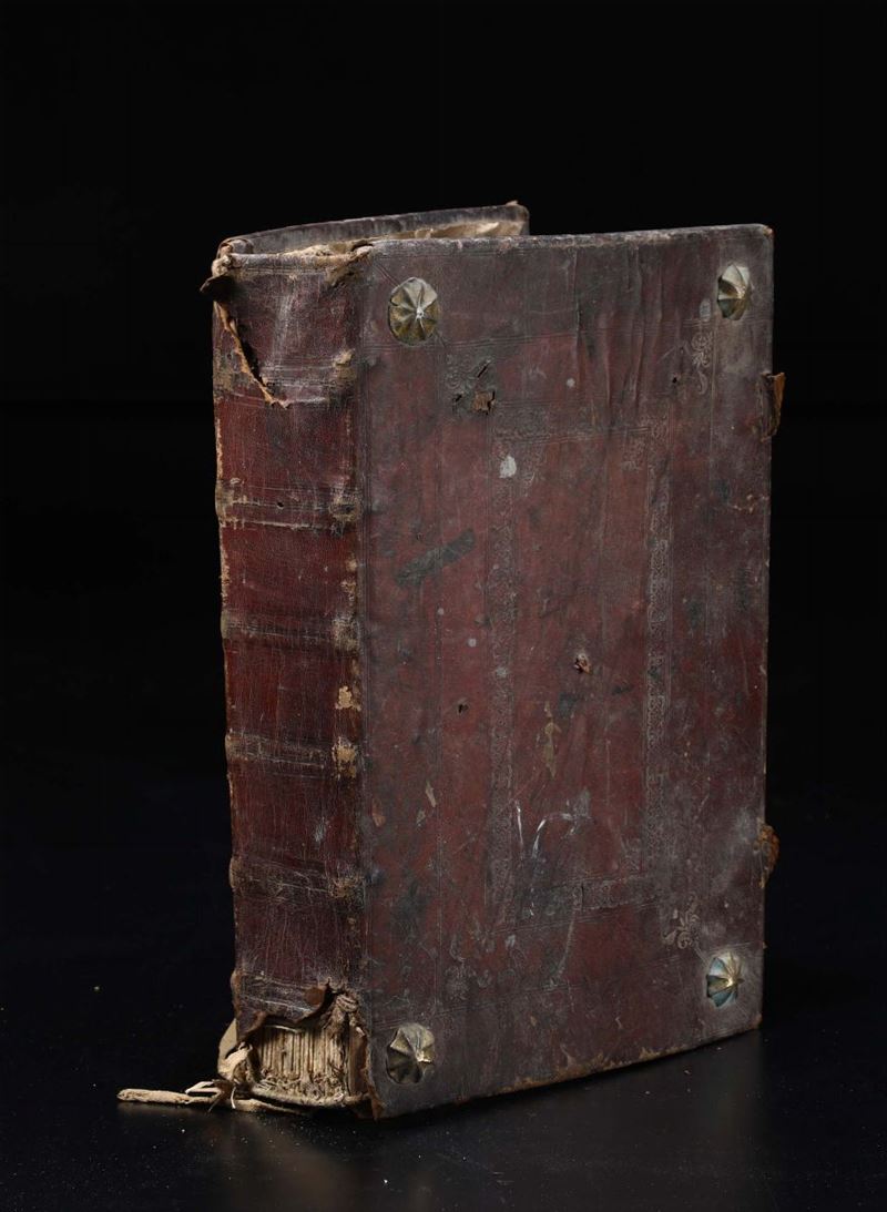 In-folio. Legatura realizzata alla fine del secolo XVI in piena pelle con impressioni a secco e borchie in metallo (abrasioni e difetti). Tracce di fibbie assenti. Danni da umidità alle prime e alle ultime carte. Fori e piccole mancanze. Il manoscritto, risulta vergato in chiara ed elegante grafia e con migliaia di capilettera rubricati nelle tonalità del rosso e del blu, presumibilmente da un'unica mano. Sulla carta 1 recto, è presente uno stemma nobiliare miniato non identificato, ripetuto due volte. Alla carta numero 243 (recto) sono presenti quattro miniature entro tondi: in alto una piccola miniatura raffigurante un sommo prelato, al piede della pagina, tre grandi tondi raffiguranti scene di martirio. Il primo raffigura una santa martire non identificata, quello centrale forse il martirio di San Lorenzo e l’ultimo probabilmente Pietro ed Andrea intenti alla pesca.