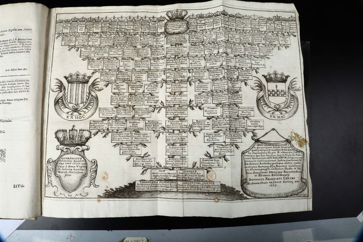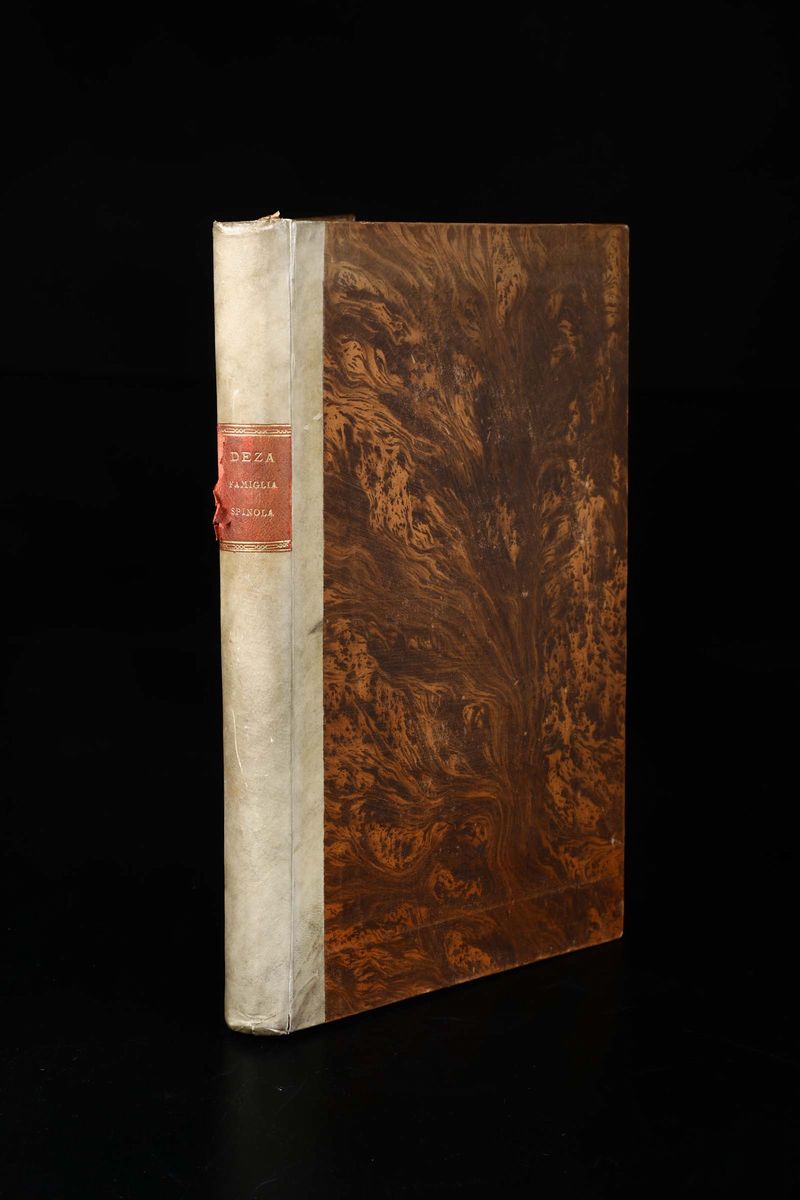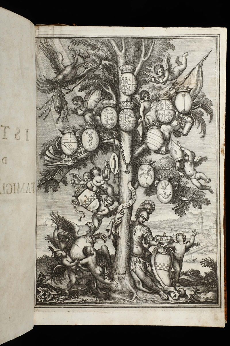In-folio. Legatura in mezza pergamena del secolo XIX. Bella antiporta incisa da disegno di Domenico Piola. Un albero genealogico ripiegato inciso in rame. Buon esemplare.