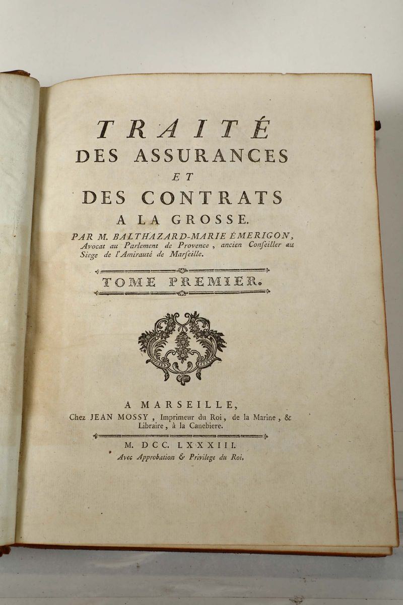 Emerigon, Baldassarre Maria Traité des assurances et den contrats..., Marsiglia, Jean Mossy, 1783, 2 volumi