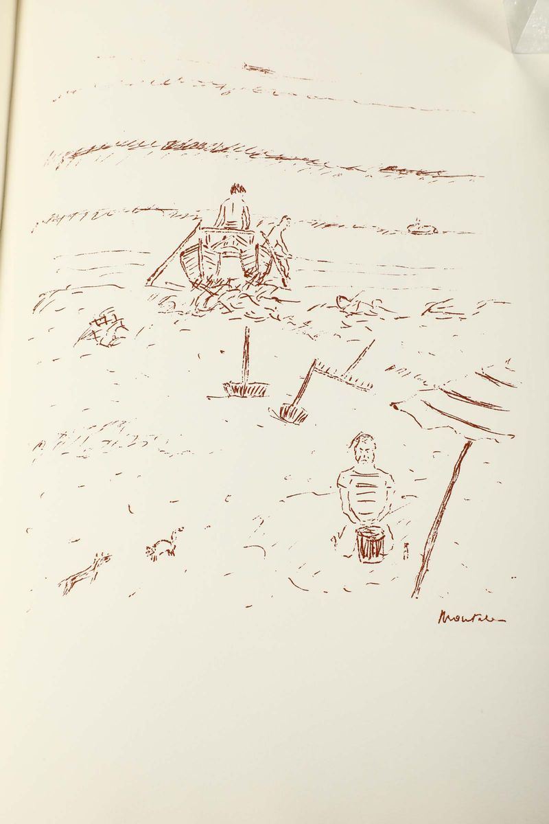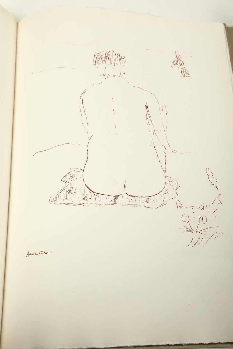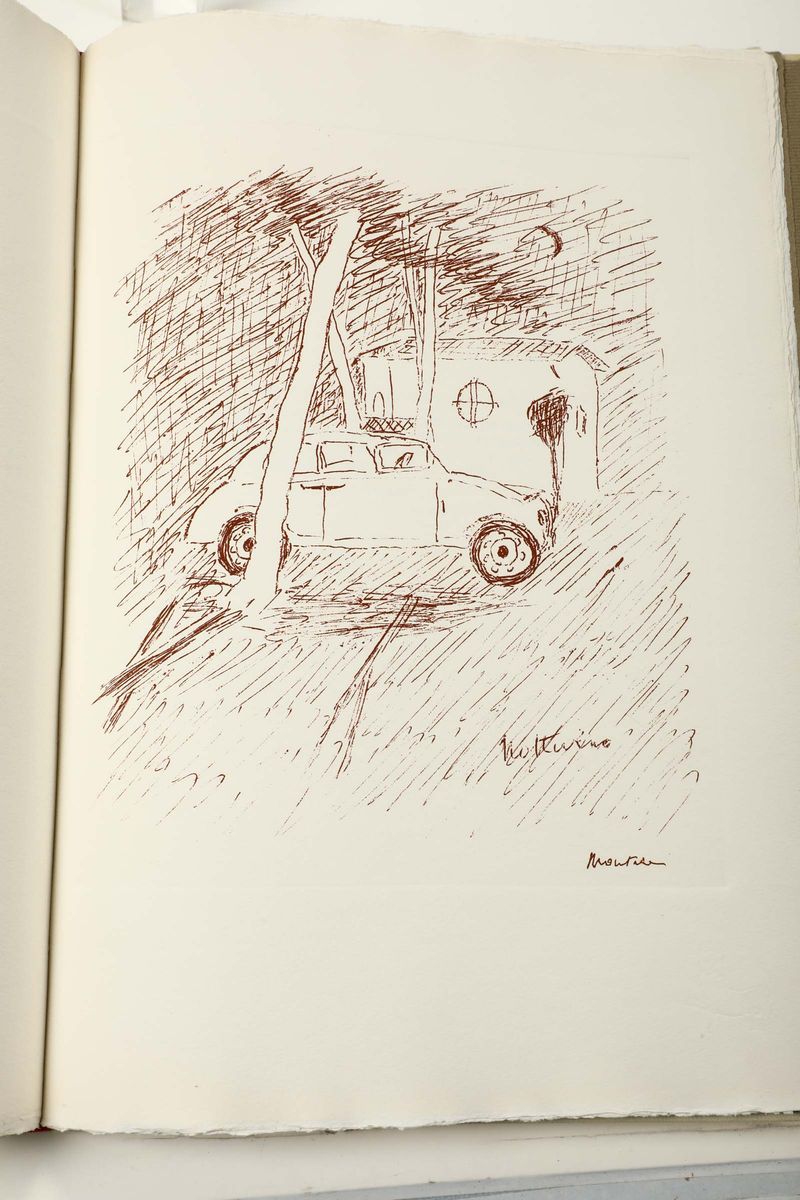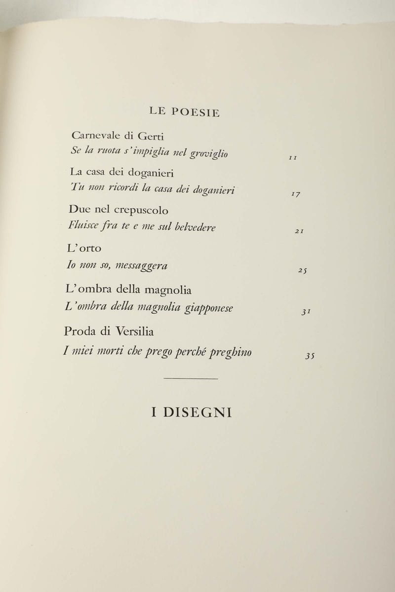 In-folio. Legatura a piena pergamena rigida entro cofanetto cartonato con motivo a finto marmo.Esemplare impresso per Sandro e Etti Megighian e arricchito con 5 incisioni di Montale stesso All'interno fotocopia del biglietto di auguri di E. Montale Natale 1976 e in ultima pagina firma a penna dell'autore stesso. Tiratura di 75 esemplari numerati.
