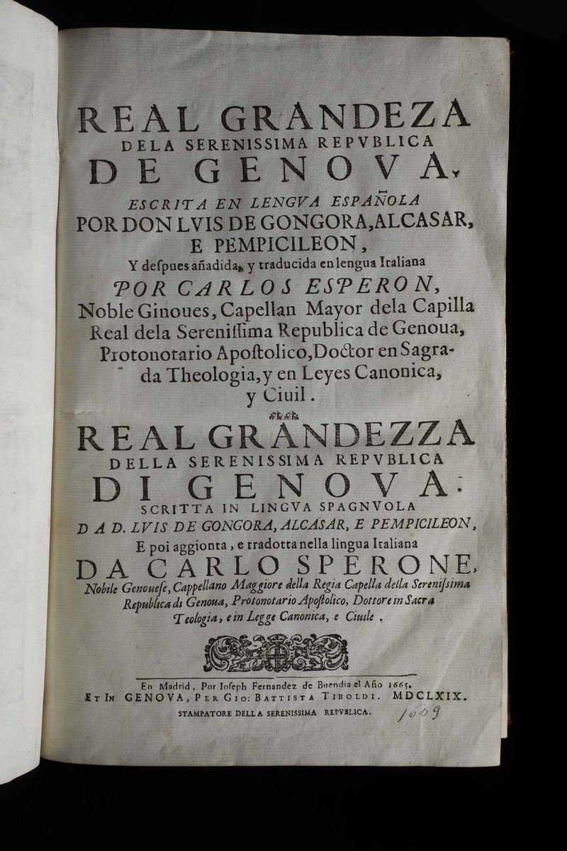 Gongora, Luis de Real Grandezza della Serenissima Repubblica di Genova...Genova, Tiboldi, 1669