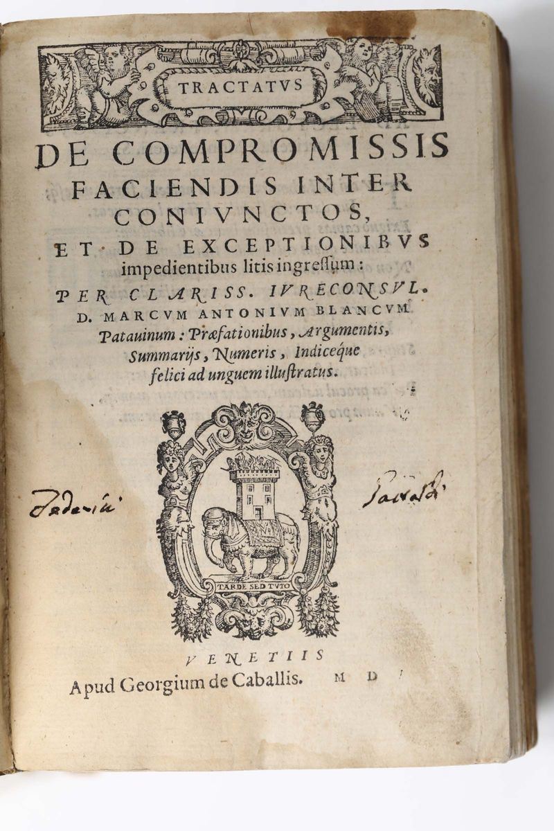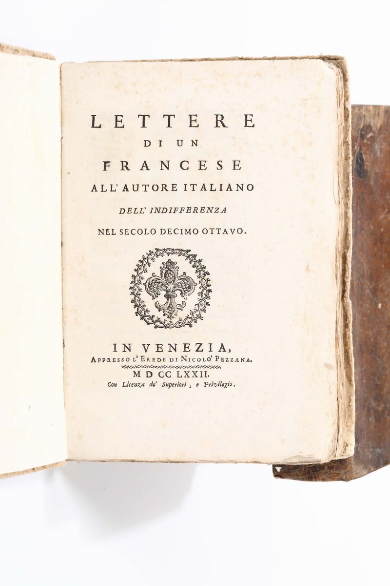 Fa parte del lotto: Blancum, Marcum Antonium, De compromissis faciendis inter coniunctos, et de exceptionbus..Venezia, Georgium de Caballis, 1565 /Lettere di un francese all'autore italiano dell'indifferenza nel secolo decimo ottavo..Venezia, Pezzana, 1772 e un altro volume.