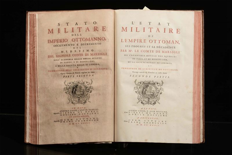 Stato militare dell’Imperio Ottomanno, incremento e decremento del medesimo,del signore Conte di Marsigli dell’academia Reale delle scienze di Parigi, e di Monpelieri, e della Società Reale di Londra, e fondatore dell’istituto di Bologna..Parti prima e seconda..La Haye & Amsterdam, Gosse & Uytwerf, 1732