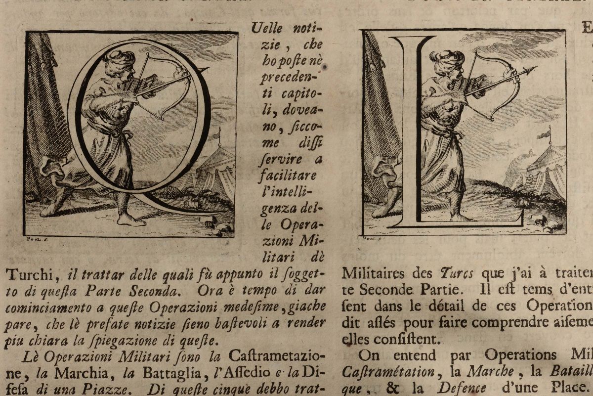 In-Folio. XVI+152 pp. /(4)+199 pp. Piacevole legatura coeva in piena pelle,che presenta alcune lievi abrasioni e piccoli difetti. Titoli e ricchi fregi in oro al dorso. Bella edizione bilingue,(italiana e francese), adorna di 44 “plances”,nel testo e fuori testo. Esemplare genuino e fresco, tuttavia non esente da alcune fioriture e bruniture dovute alla qualità della carta.