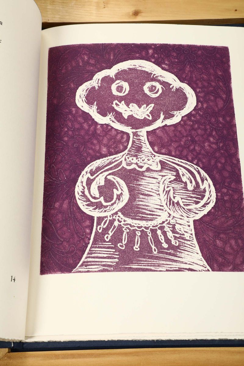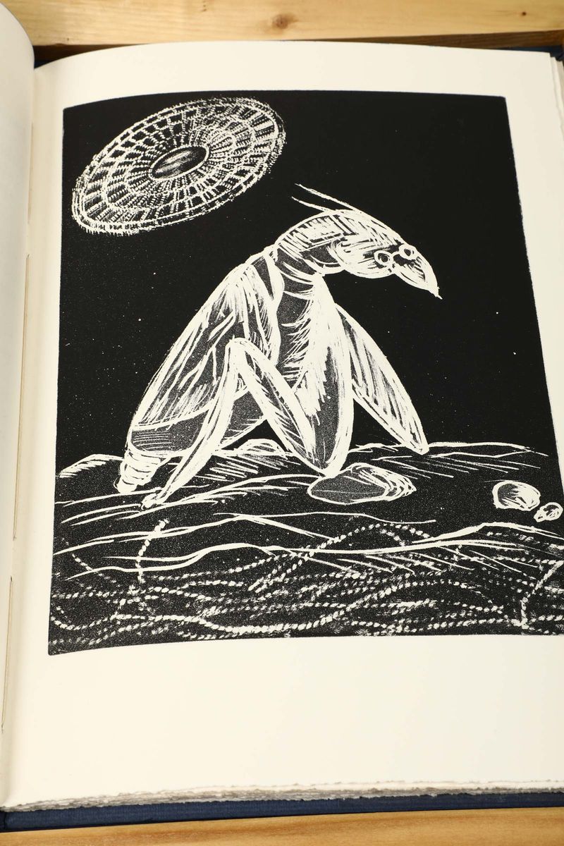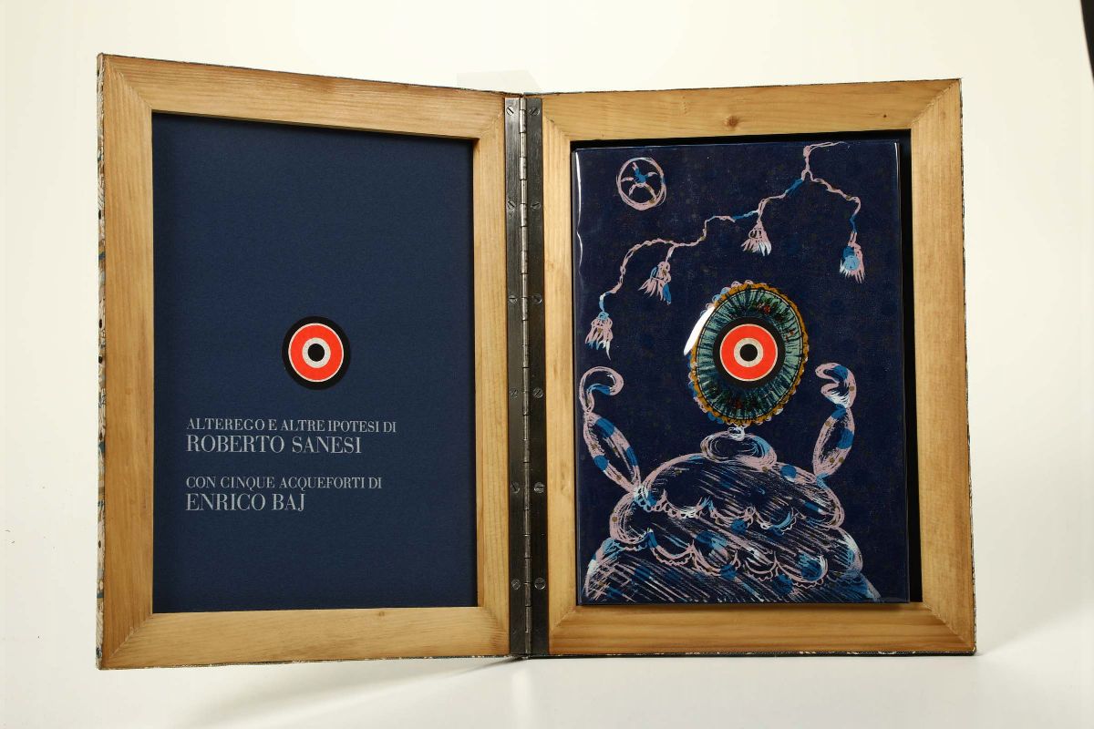 In-4°. Legatura in brossura alla francese con acetato entro cofanetto con struttura lignea e rivestimento in tessuto. Con 5 acqueforti di Enrico Baj. Tiratura di 93 esemplari numerati.