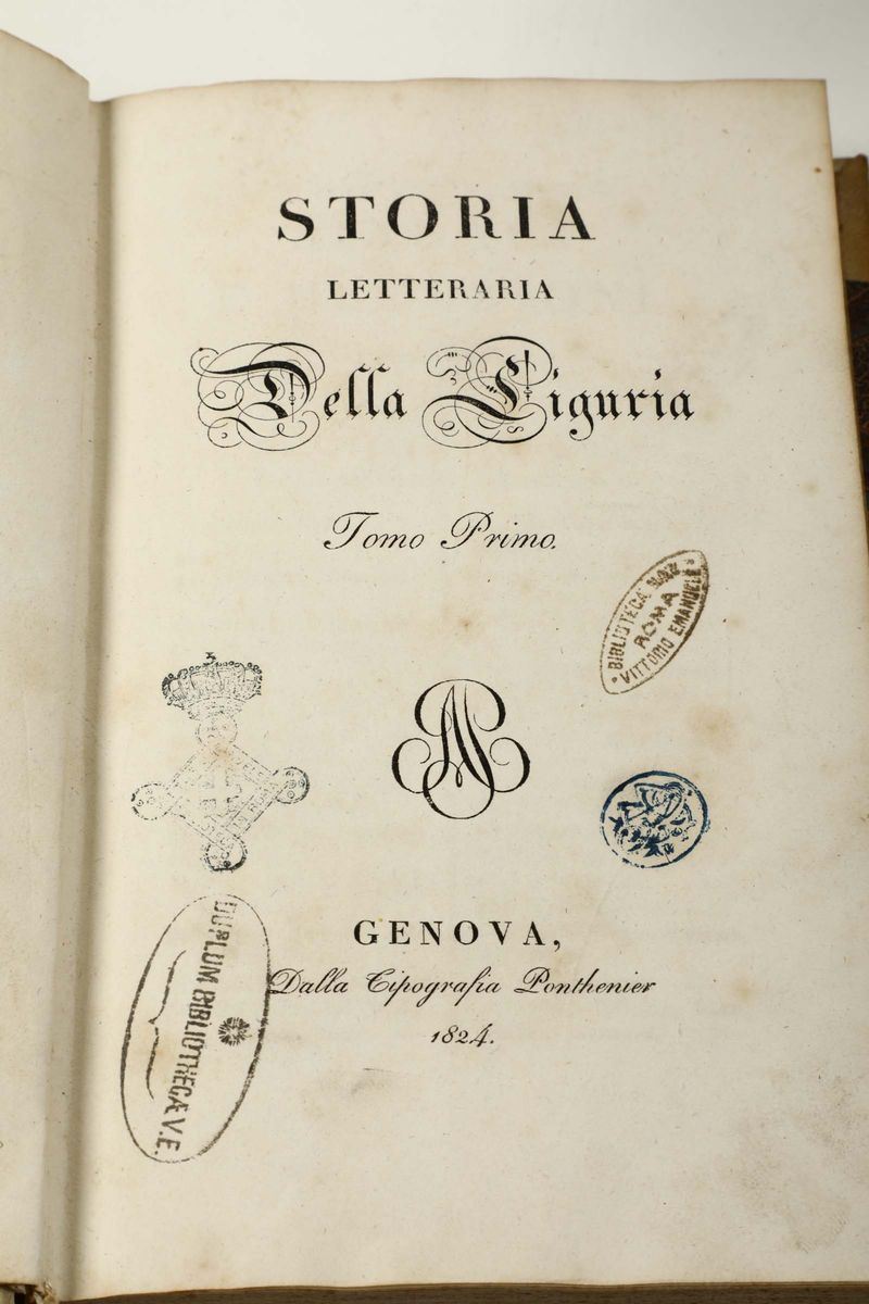 In-8°. Legatura coeva in mezza pergamena e punte. Buon esemplare di questa monografia sugli scrittori liguri, mancante come spesso accade, del V volume che uscì postumo oltre vent'anni dopo la morte dell'autore. Esemplare proveniente dalla Biblioteca nazionale Vittorio Emanuele, con i timbri di duplicato. E' noto che finchè è stato possibile, la Biblioteca nazionale Vittorio Emanuele di Roma ha alienato i propri duplicati.