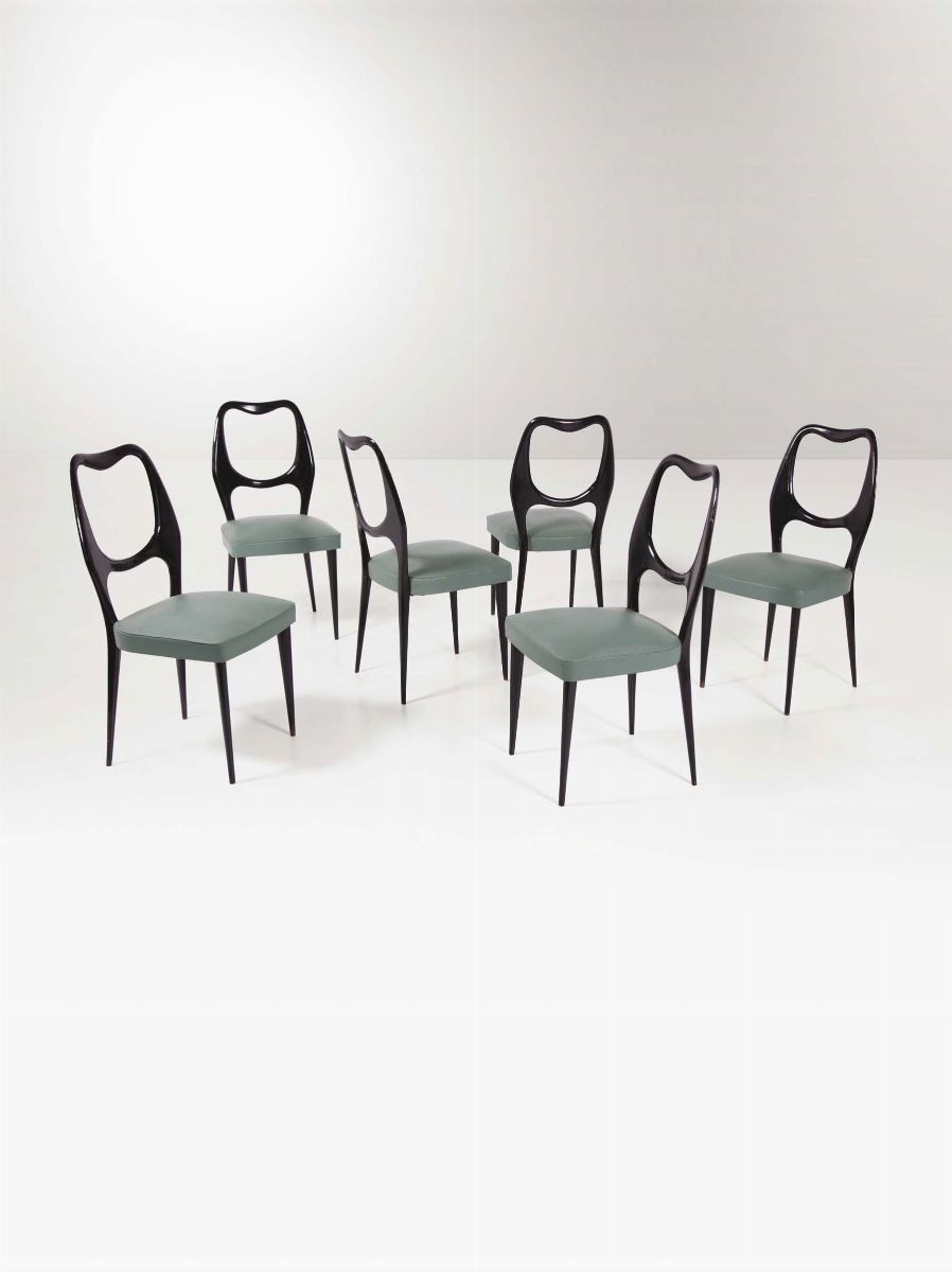 Tavolo in legno ebanizzato con piano in vetro e puntali in ottone. Sei sedie in legno ebanizzato con seduta in skai. Prod. Dassi, Italia, 1950 ca. Tavolo: cm 210x80x95; Sedie: cm 43x95x63