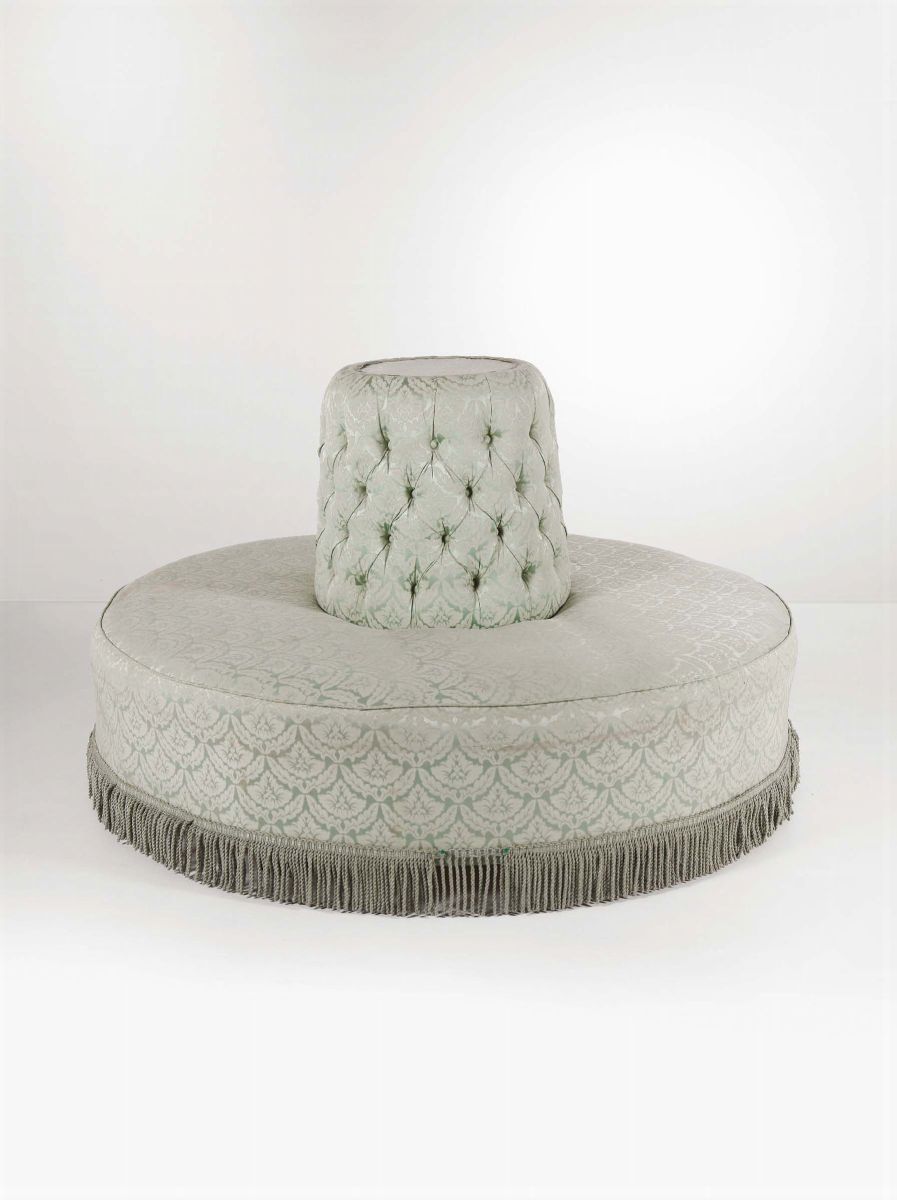 Divano circolare con struttura in legno e rivestimenti in tessuto.