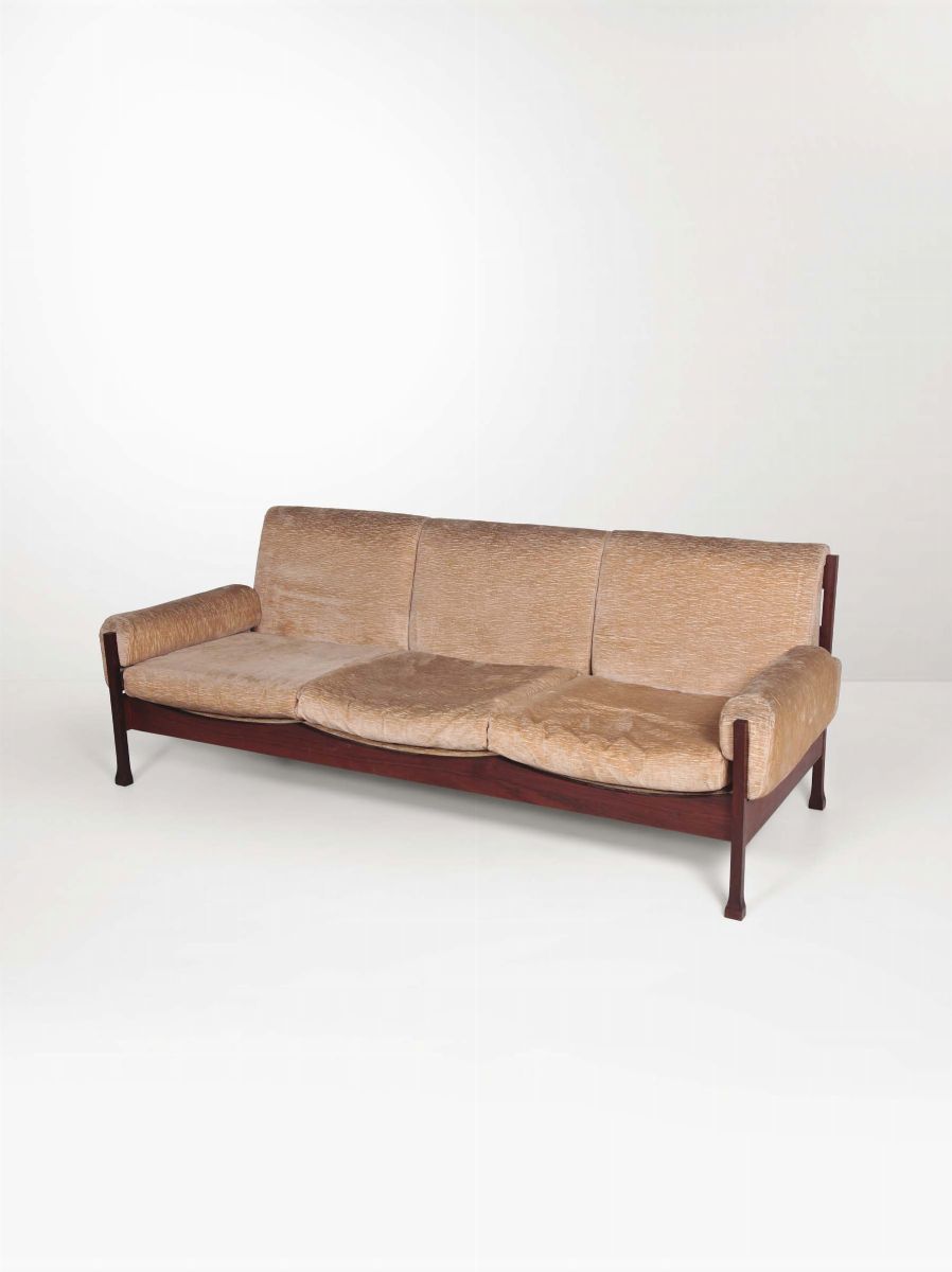 Divano con struttura in legno e rivestimenti in tessuto.
