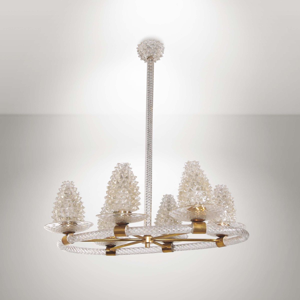 Lampada da sospensione con strutttura in vetro di Murano rostrato e ottone. Diffusori in vetro rostrato. Prod. Italia, 1940 ca. cm 70x90x55