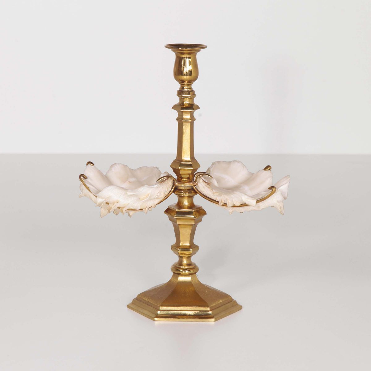 Candelabro con struttura in ottone e supporti in madreperla. Firma originale. Prod. Crespi, Italia, 1970 ca. cm 25x31x16