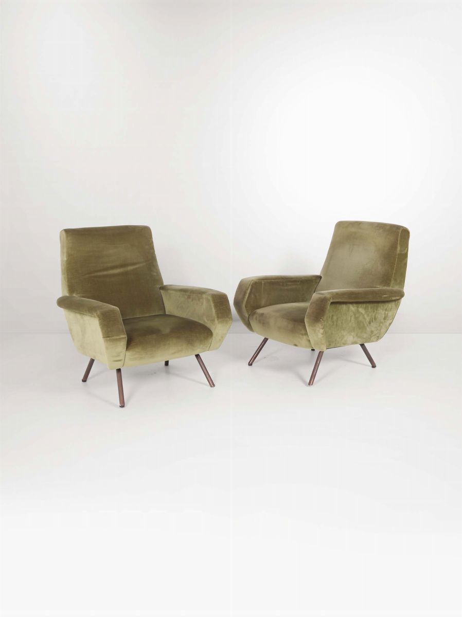 Gianfranco Frattini Coppia di poltrone con struttura in legno, supporti in ottone e rivestimenti in tessuto.