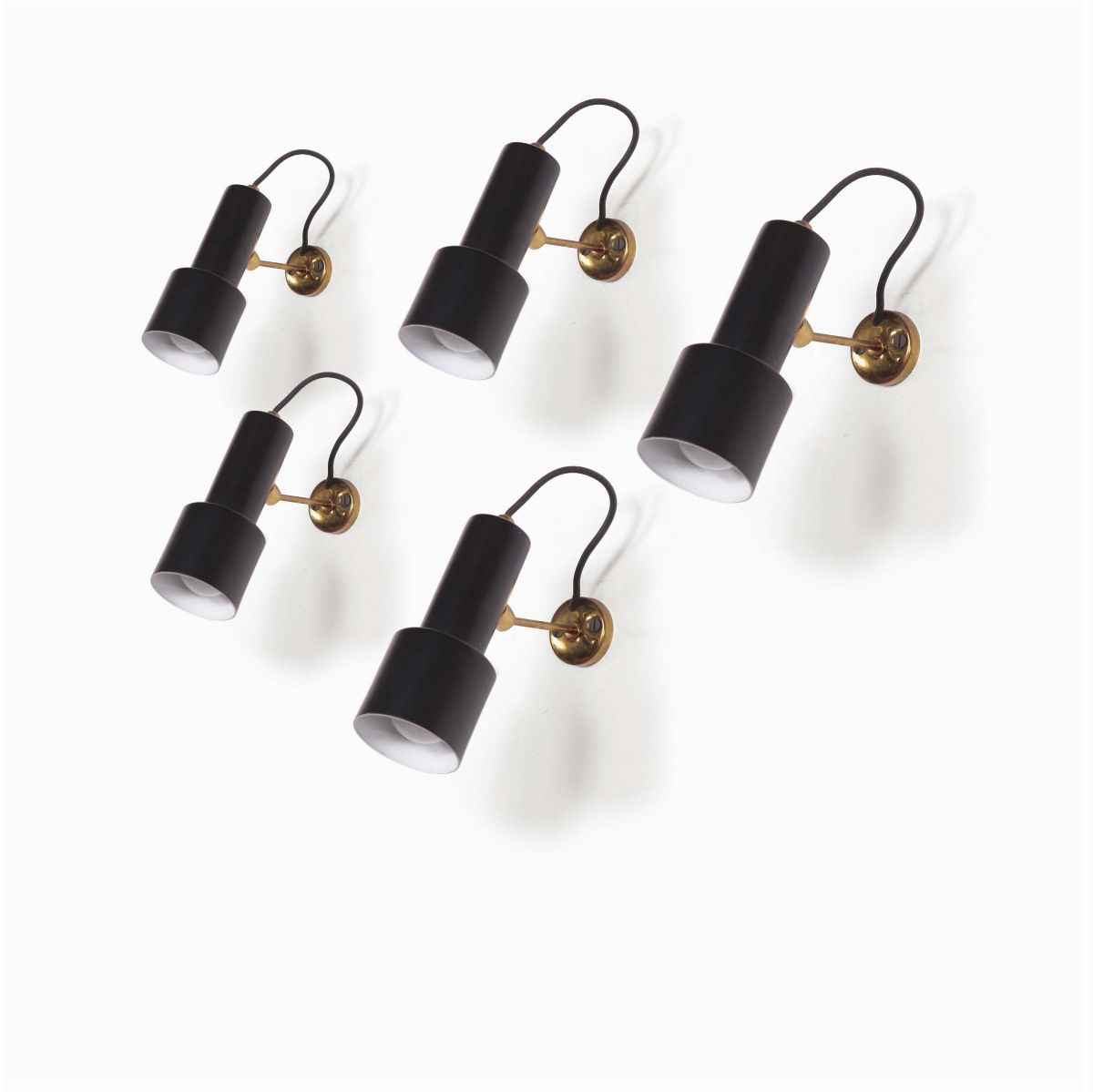 Cinque appliques con struttura in ottone e metallo laccato. Prod. Oluce, Italia, 1950 ca. cm 7x15x19