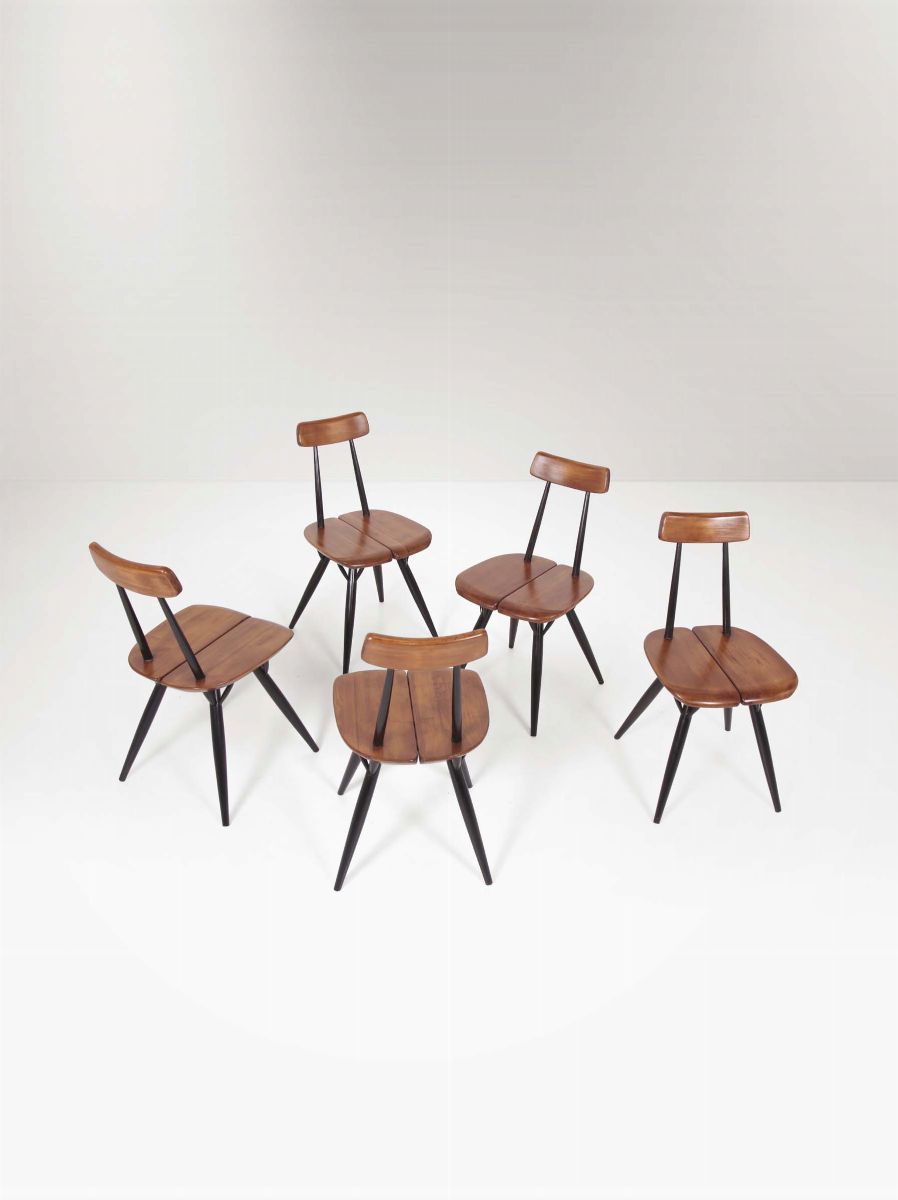Cinque sedie con struttura in legno e legno laccato. Marchio originale. Prod. Artek, Finlandia, 1950 ca. cm 41x76x45