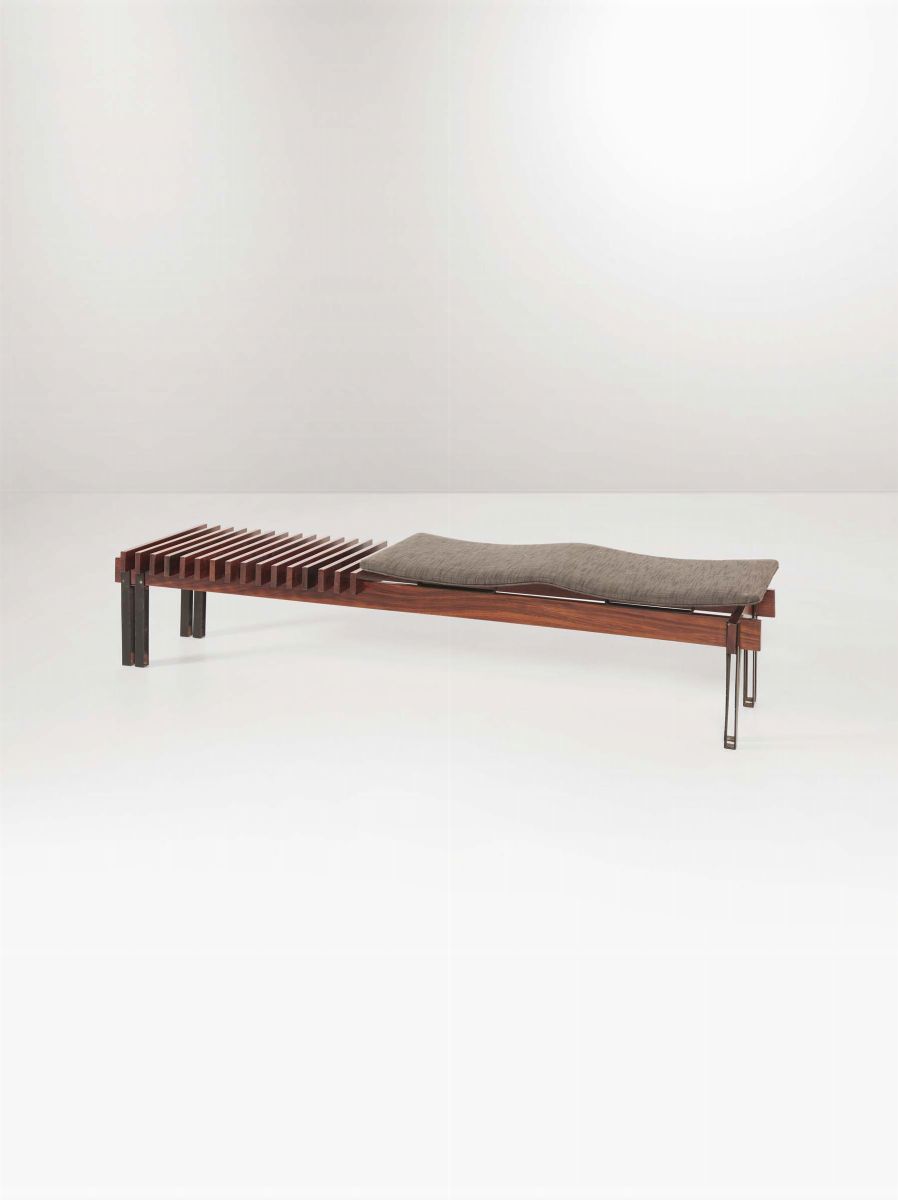 Panca con struttura in legno e seduta con rivestimento in stoffa Prod. Italia, 1950 ca. cm 162x35x42
