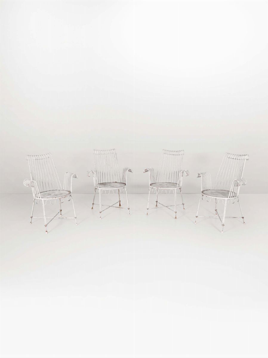 Tavolo e quattro sedie con struttura in metallo laccato. Piano in vetro.