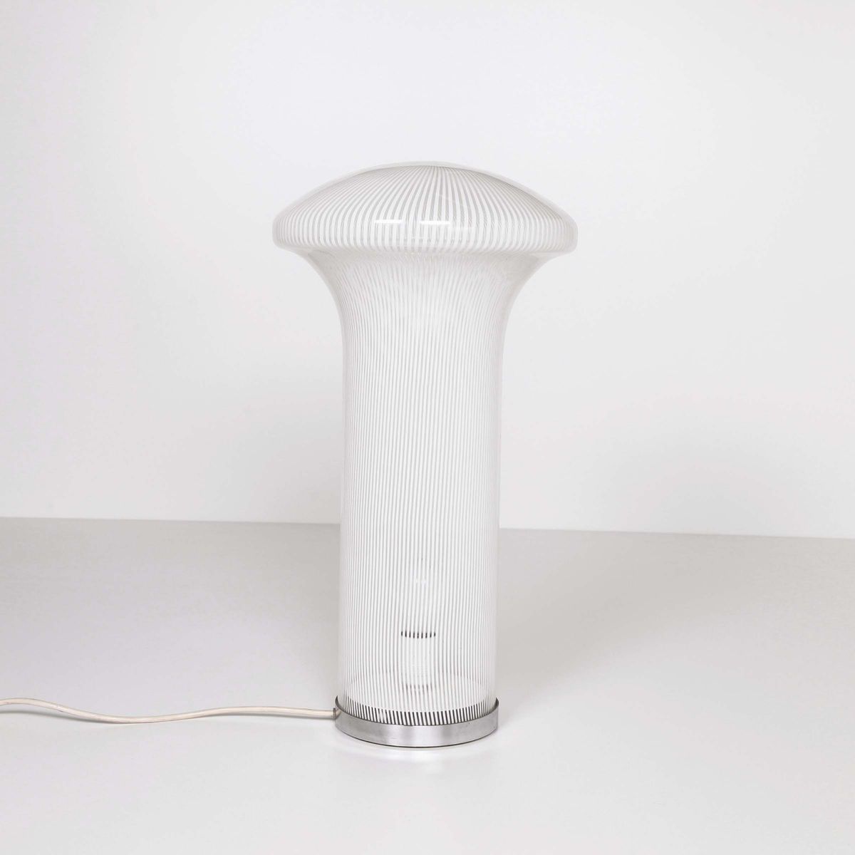Lampada da tavolo Boletus in vetro sof ato inciso alla ruota con base in metallo cromato. Prod. Venini, Italia, 1960 ca. cm 32x56