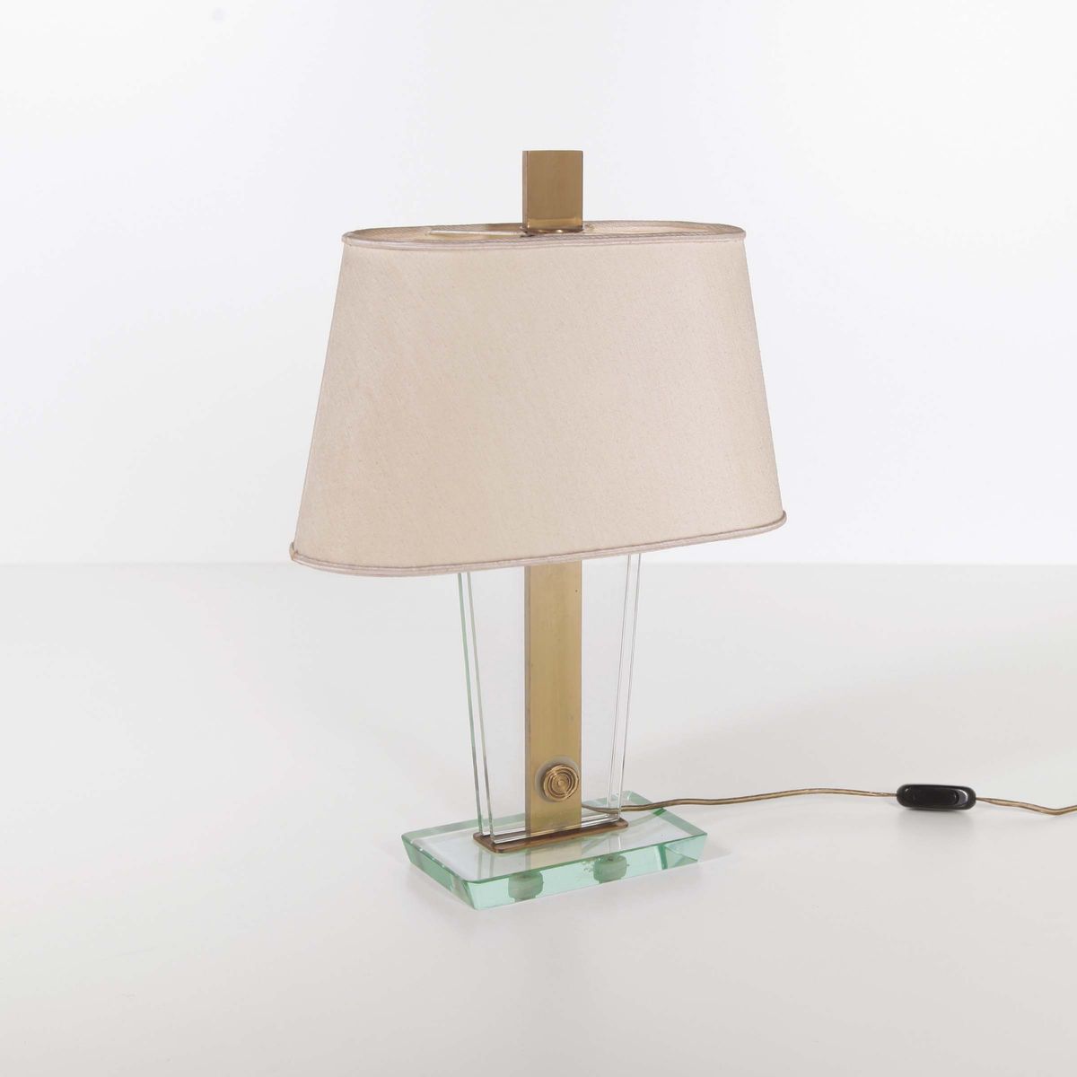 Lampada da tavolo con base in vetro molato, struttura in vetro molato ed ottone lucido e paralume in stoffa