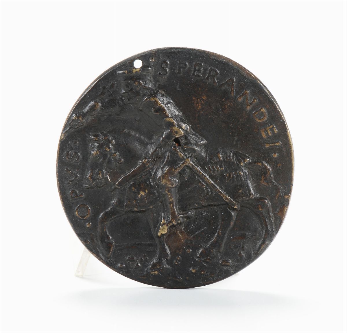Lotto composto da medaglia ovale con figura di guerriero classico e scritta incisa “Scipione.A” e medaglia tonda con effige di Federico Da Montefeltro e iscrizione e sul verso figura equestre di Federico con scritta “Opus Sperandei”. (Bartolomeo Di Sperandio Savelli 1451-1504).