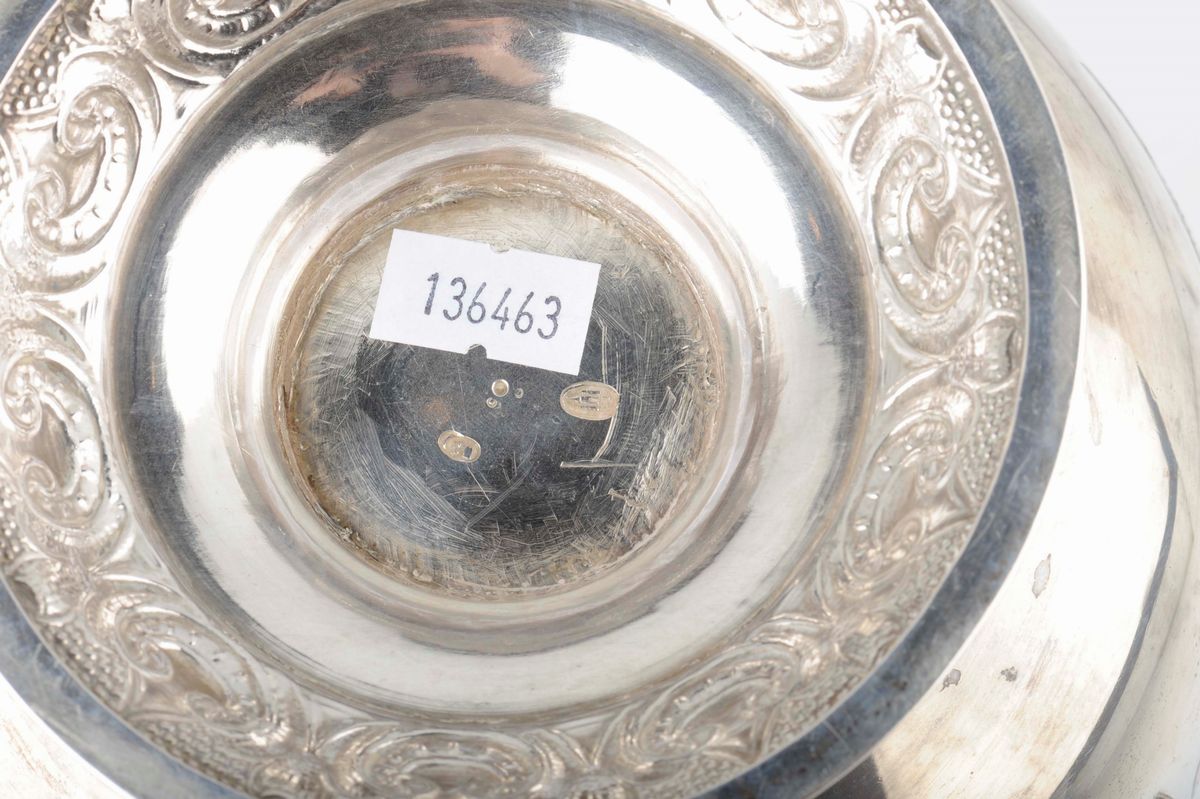 corpo decorato con motivi di animali fantastici, riserve e volute, attacco del manico con bel mascherone femminile, gr. 1050, altezza cm 36,5