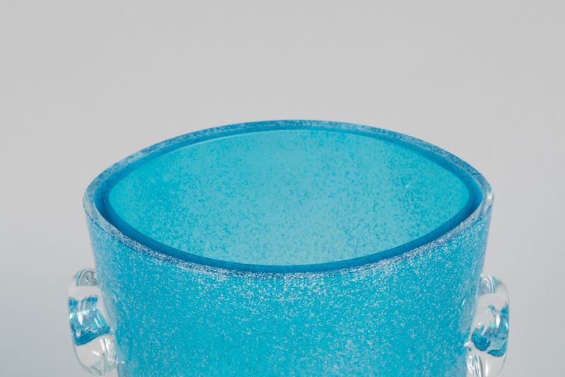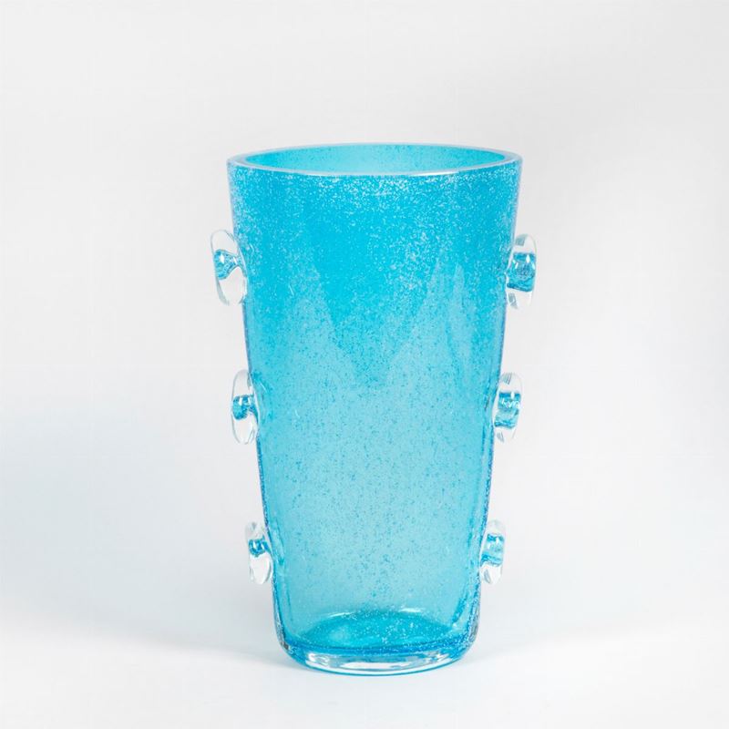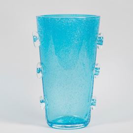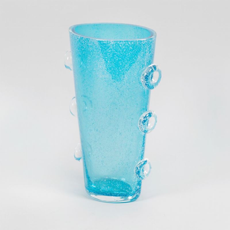 Vaso troncoconico in vetro con decoro di polveri e anelli applicati.