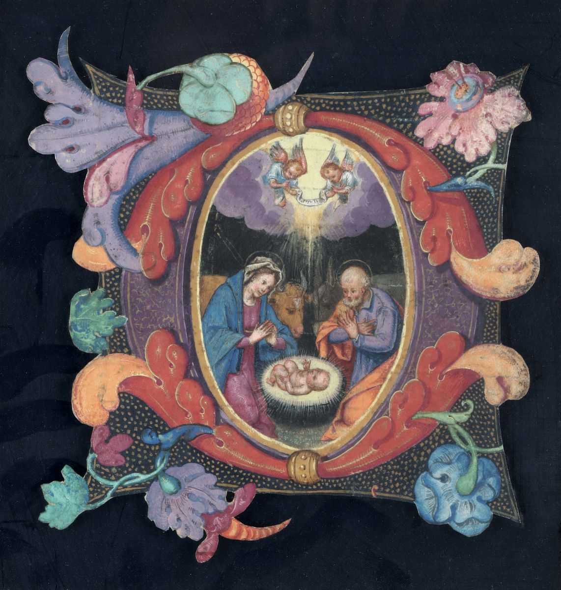 Capolettera su pergamena con natività, XVI secolo