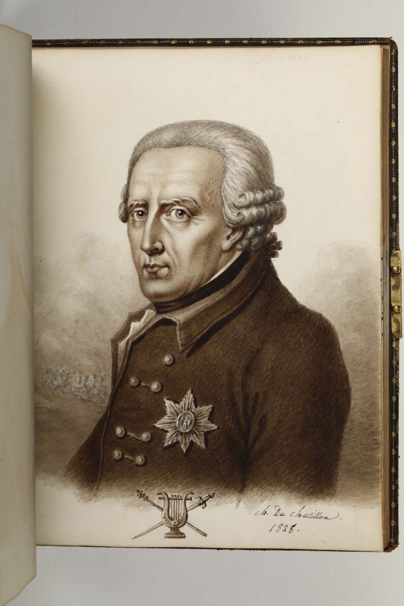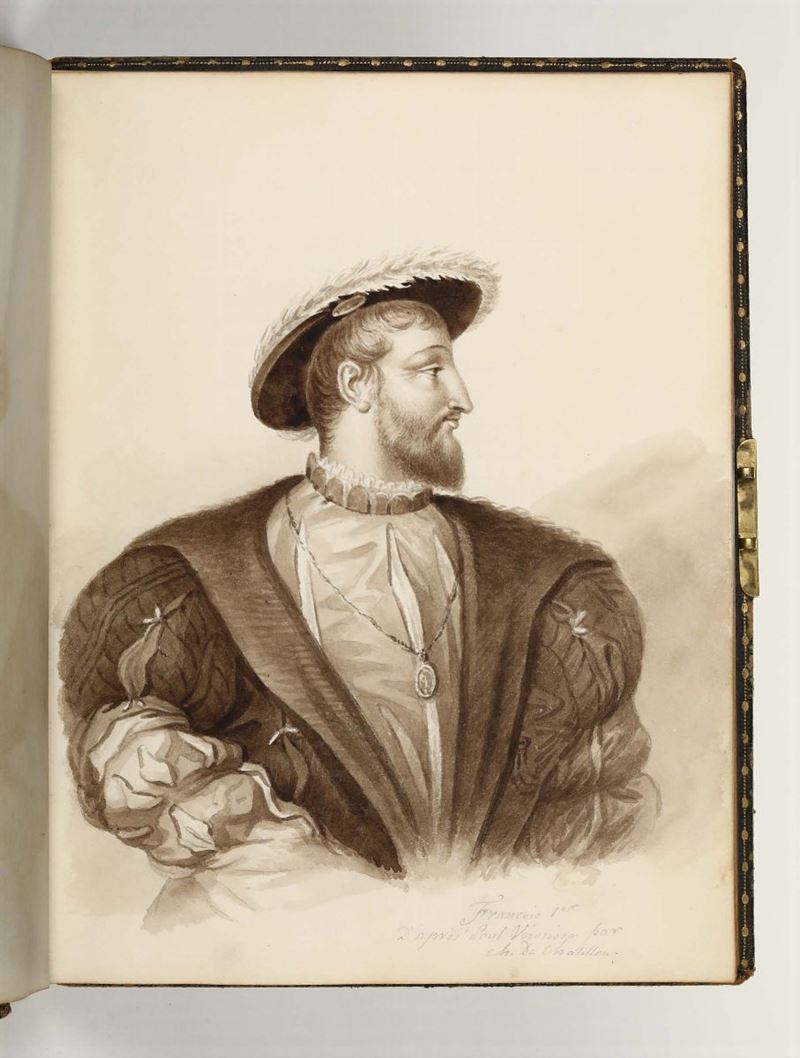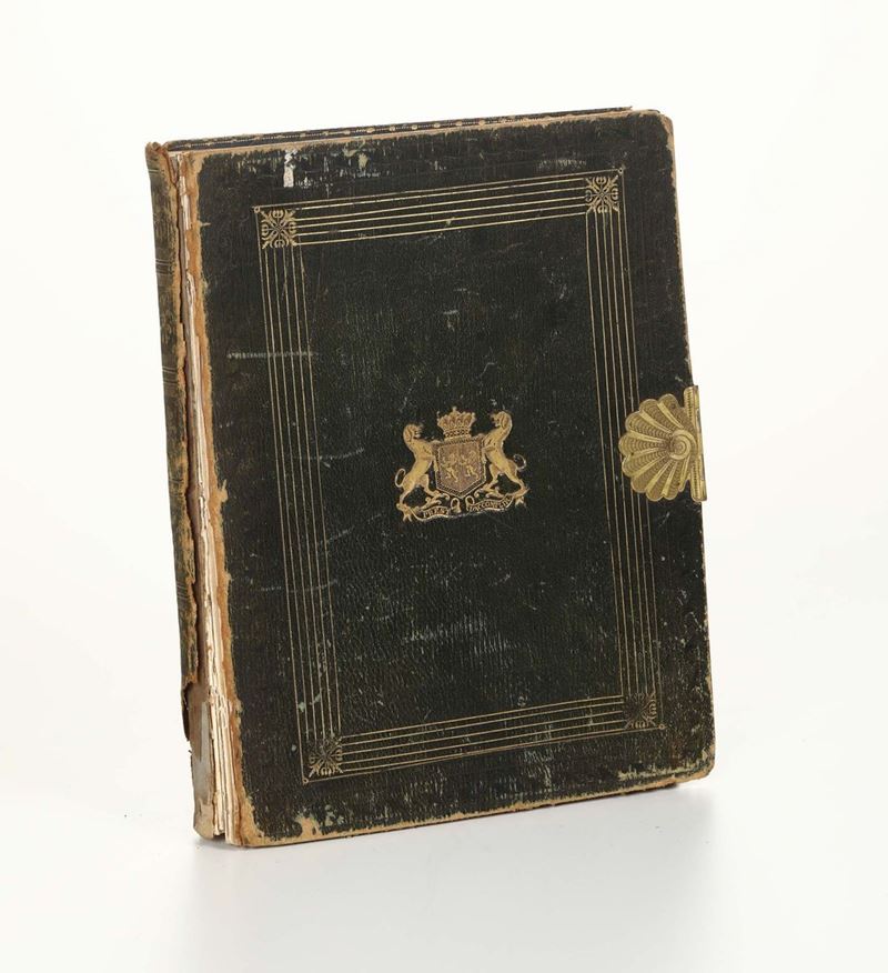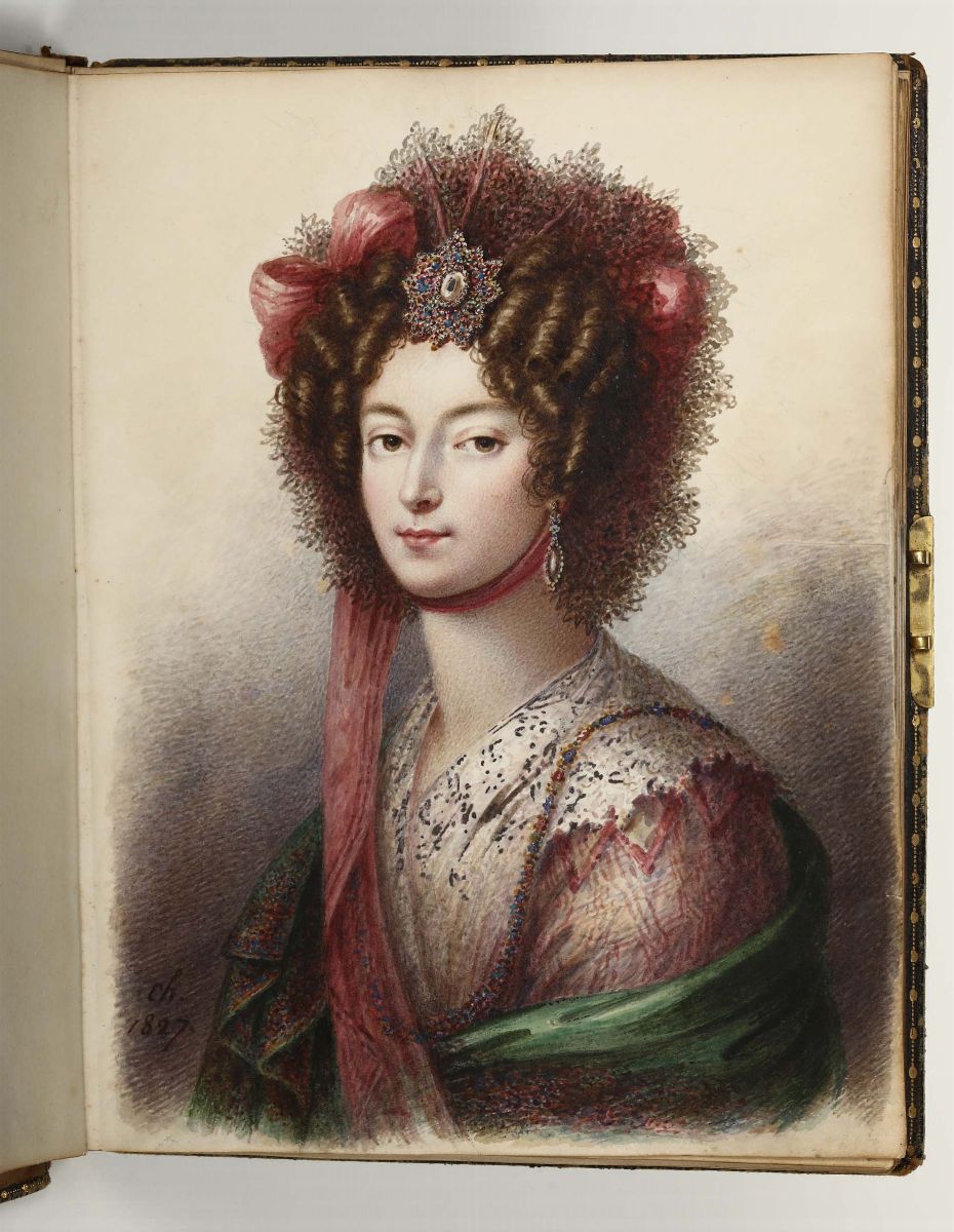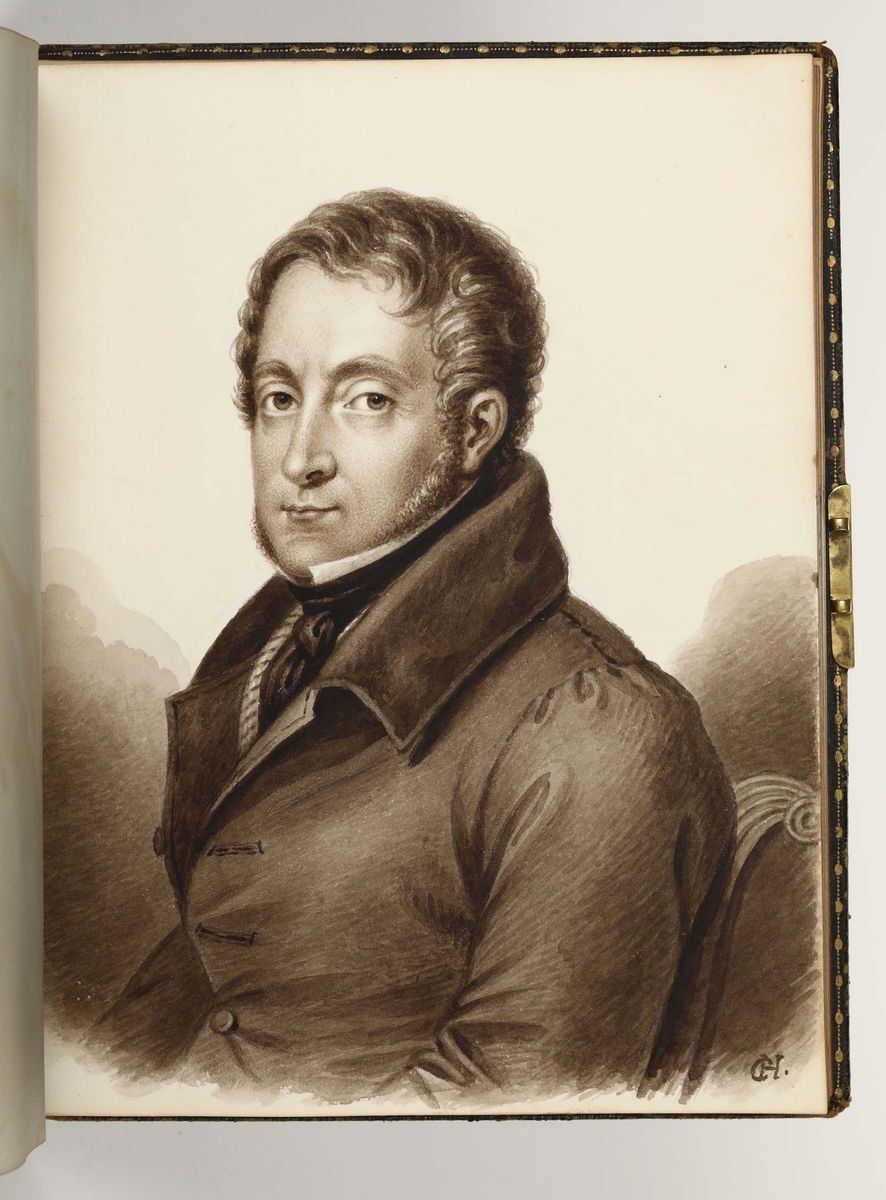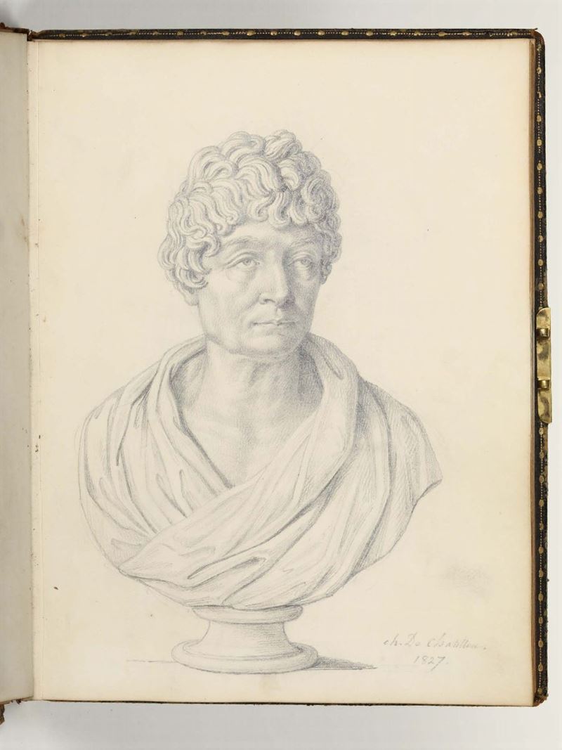Album contenente ventisei disegni ed acquerelli, datati 1827 e 1828, alcuni monogrammati ed altri firmati. Entro legatura coeva alle armi sormontata da corona chiusa (famiglia di Duchi o Principi)