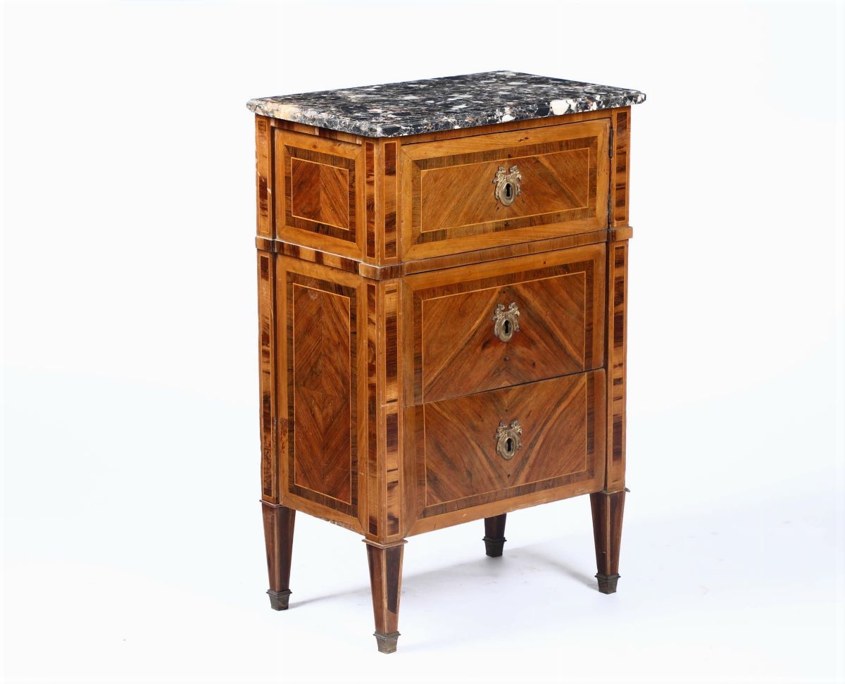 Comodino Luigi XVI lastronato e filettato, Genova XVIII-XIX secolo