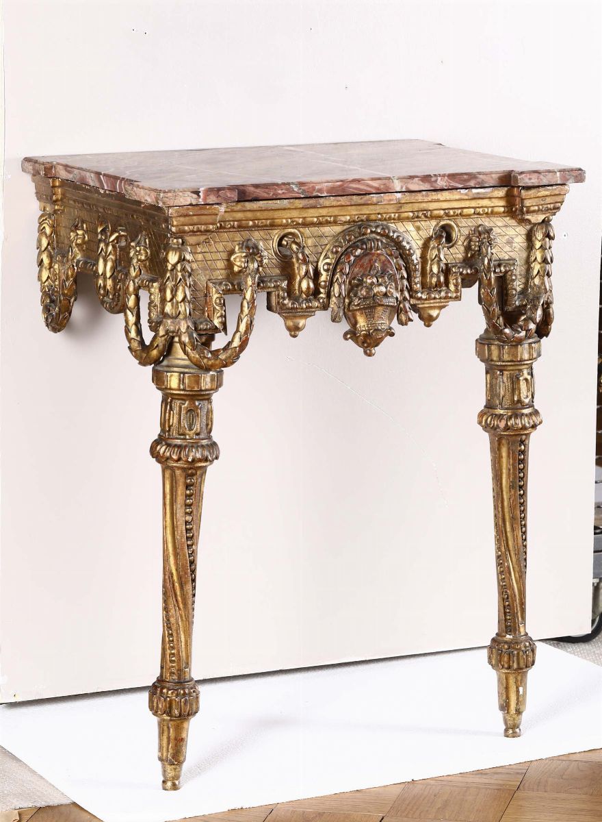 piano in marmo sagomato, due gambe scanalate e perlinate, cm 63x45x80