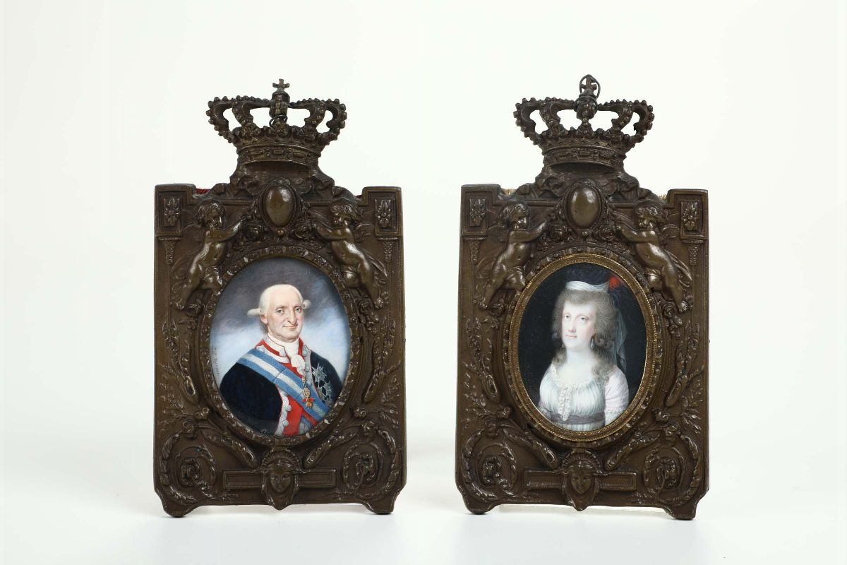 Coppia di miniature raffiguranti ritratto maschile e femminile, in cornice di bronzo dorato
