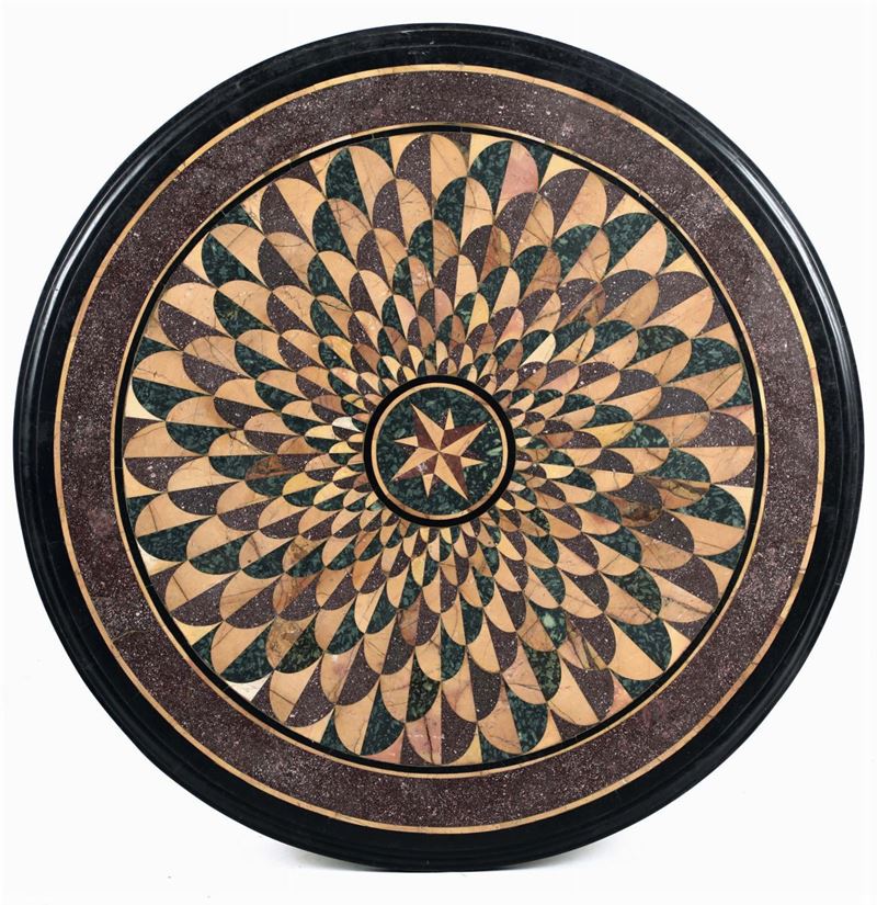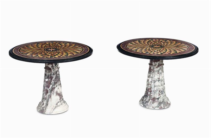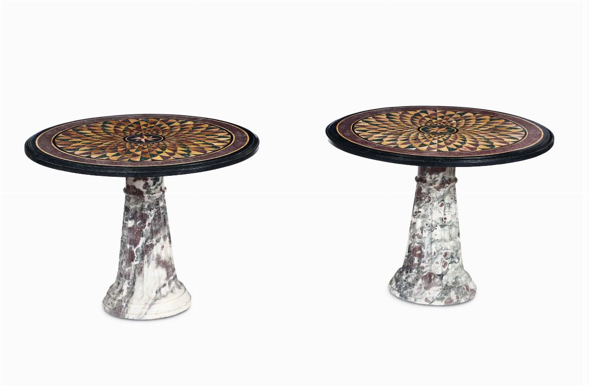 Coppia di tavoli con piano circolare con base in marmo scanalato, produzione romana del XX secolo