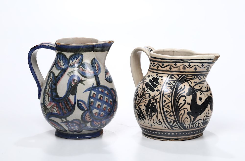 Due boccali monoansati, decoro di gusto neomedievale, Deruta anni '30