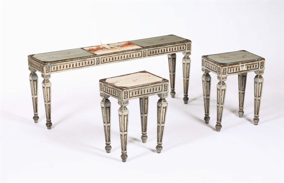 Due panchetti e tavolino in legno intagliato e laccato, fine XVIII secolo